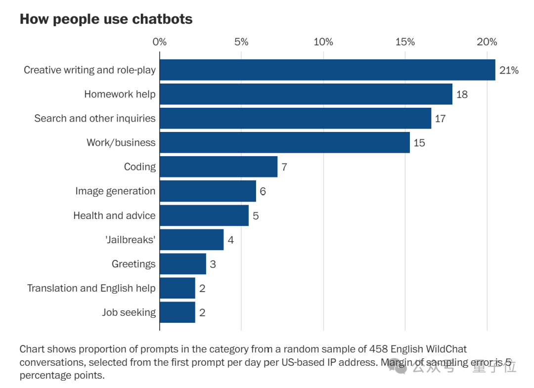 可以看出,人们主要用ChatGPT来写作(21%)以及帮助完成家庭作业(18%)。