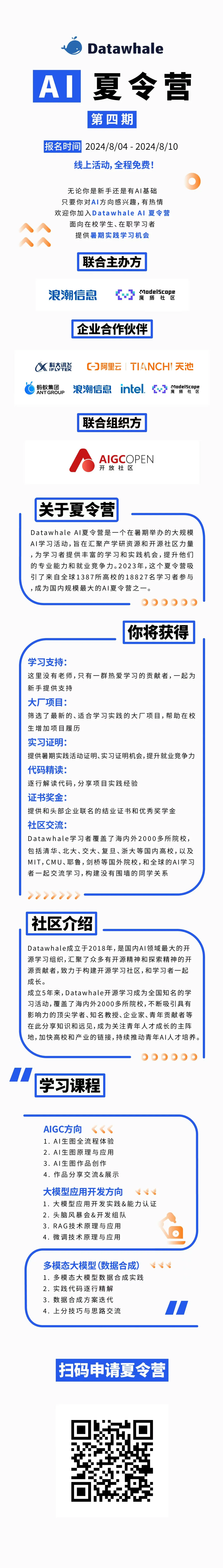 2024 AI夏令营,由Datawhale主办,联合科大讯飞、阿里云天池、蚂蚁集团、英特尔、浪潮信息、魔搭社区等国内外顶尖人工智能企业。