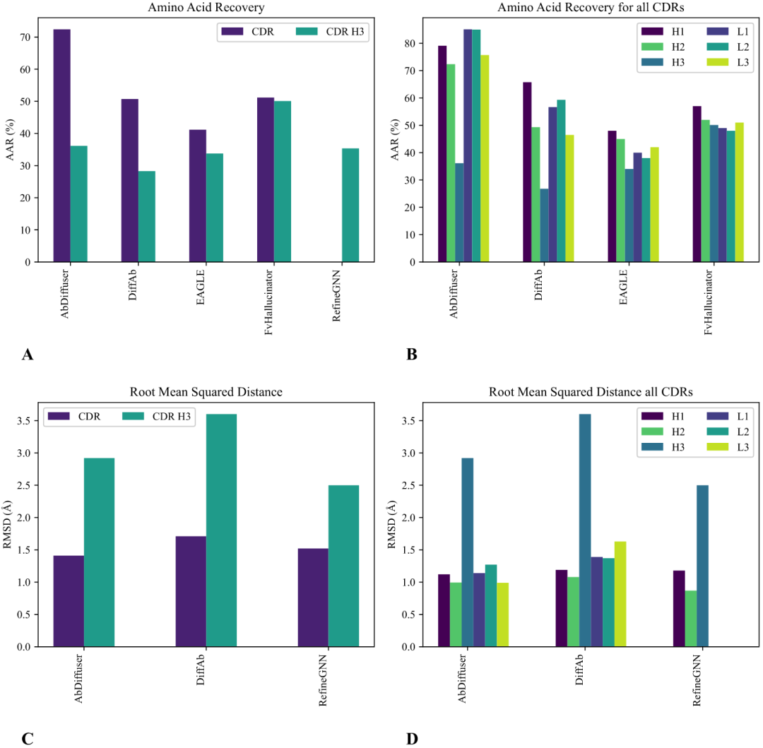 FvHallucinator是一种基于幻觉的序列设计方法,它蛋白设计扩展到抗体可变区设计,使用参考结构(固定骨架设计,见上图C)产生Fv序列库。没有野生型种子,该模型的性能显著下降,大约为15-50%(CDRH3的恢复率)。幻觉技术的局限性在实验中变得明显。使用这些方法生成的结构通常在实验室环境中无法产生正确折叠的蛋白质。这些技术在设计较大的分子时也面临困难,因为它们主要关注较小的蛋白质。