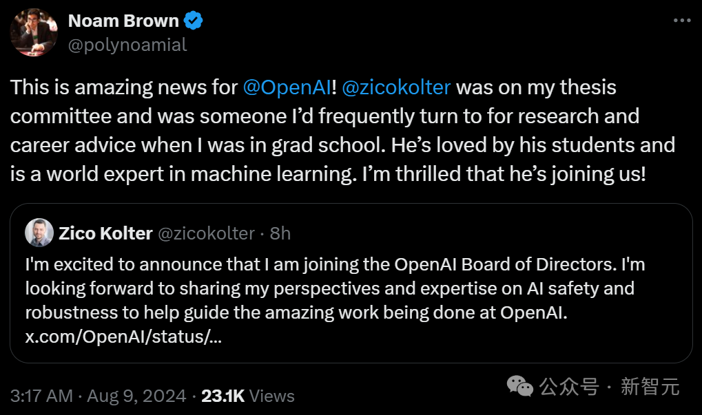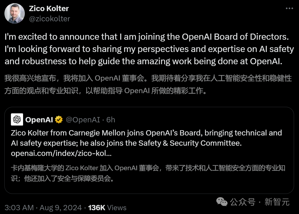 董事会主席Bret Taylor在欢迎Kolter加入董事会时表示,「Zico的到来,增加了对人工智能安全性的深刻技术理解,这将有助于我们确保通用人工智能造福全人类。」