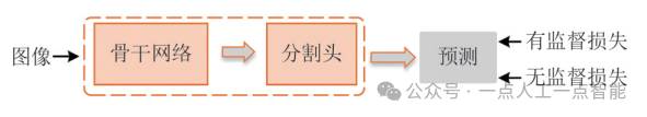 Consistency, CISC),即通过计算无标签数据和查询到的有标签数据之间的像素级相似性,生成一个跨图像语义一致性图,用于指导像素级伪标签的修正。该方法使用基于CISC的图像选择方法,划分出可靠的和不可靠的无标签数据,并进行阶段性的重新训练。这种训练过程能够实现图像级可靠的伪标签选择,从而更有效地利用无标签图像。ELN[41]方法设计了一个额外的错误定位模块。该模块将图像和预测结果作为输入,尝试判断预测中可能出错的像素位置,进而达到错误定位的目的。在训练过程中忽略这些错误的区域,可缓解确信偏置对模型性能造成的不良影响。基于多网络架构和基于多阶段架构的方法都增加了模型训练成本,导致研究者需要在模型性能和训练成本之间进行权衡。因此,自从FixMatch[56]方法提出一种单阶段的端到端的训练范式并成为半监督分类任务的主流后,很多半监督语义分割任务受其启发也开始设计更简便高效的网络结构。单阶段端到端架构仅包含一个网络,并且仅需一次训练就能完成整个训练过程,如图3所示。PseudoSeg[31]方法在FixMatch的基础上,将分割模型预测与类激活图(Class Activation