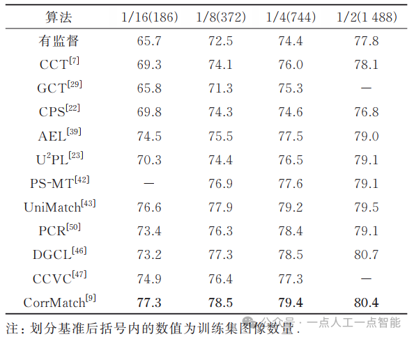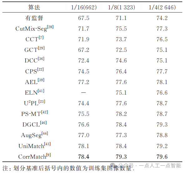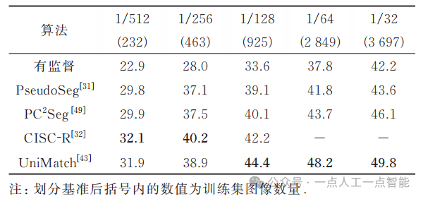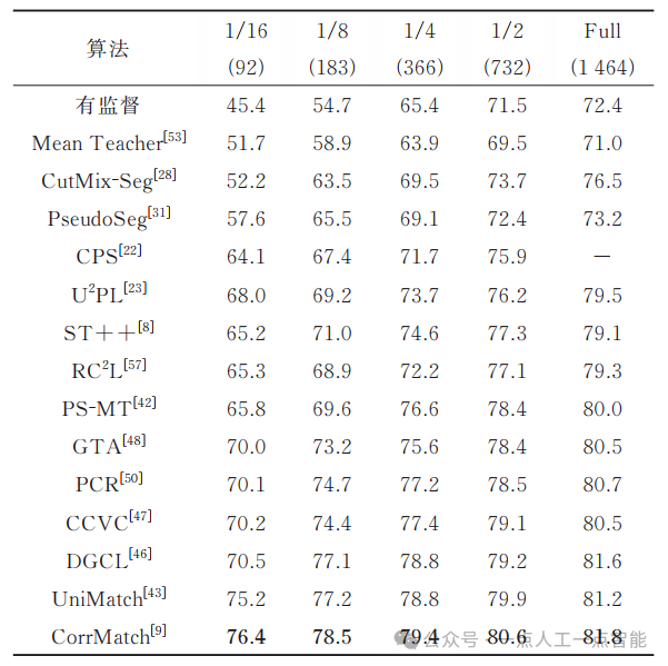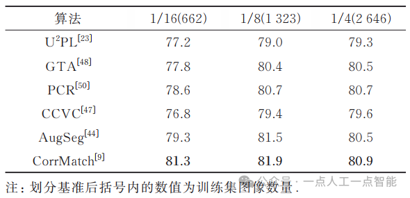 Intersection-over-Union, mIoU)作为评价指标。在模型验证时,对于PASCAL VOC 2012数据集,使用原始图像进行验证;对于Cityscapes数据集,采用滑动窗口的方法进行验证。同时,如无特殊说明,所有的验证都是在单一尺度下进行的。3.2 PASCAL VOC 2012 (classic)在PASCAL VOC 2012 (classic)设定下,一些有代表性的最先进方法的mIoU性能比较, 如表3所示。由表3可知:①近年来半监督语义分割的性能获得了极大提升。②基于多网络架构的方法和基于多阶段架构的方法作为在UniMatch[43]和CorrMatch[9]前的主流方法,均取得了较好的性能。例如,相较于仅使用有监督的方法,基于多阶段架构的方法ST++[8]在不同的数据划分基准上分别取得了19.8%、16.3%、9.2%、5.8%以及6.7%的性能提升,基于多网络架构的PS-MT[42]方法也取得了20.4%、14.9%、11.2%、6.9%以及7.6%的性能提升。③基于单阶段端到端架构的方法使用简便的方法达到了最先进的性能,并且在数据量极少的场景下性能提升非常明显。在仅使用92张有标签数据的设定下,UniMatch相较于PCR,mIoU提升了5.1%;CorrMatch相较于UniMatch,mIoU又取得了1.2%的提升,达到了76.4%。表3 PASCAL VOC 2012 (classic) 设定下各方法的mIoU比较 (%)3.3 PASCAL VOC 2012 (blender)在2种PASCAL VOC 2012 (blender)设定下,一些有代表性的最先进方法的mIoU性能比较如表4和表5所示,表4和表5分别使用的是CPS[22]和U2PL[23]给出的划分方式。表4 PASCAL VOC 2012 (blender) 设定下使用CPS划分方式时各方法mIoU的比较(%)表5 PASCAL VOC 2012 (blender) 设定下使用U2PL划分方式时各方法mIoU的比较(%)①与classic设定下的趋势相同,在blender设定下,各类方法的性能也有了显著的提升。同时,与基于多网络架构的方法和基于多阶段架构的方法相比,基于单阶段端到端架构的方法也取得了最好的性能。②使用CPS划分方式时,相较于仅使用有监督的方法,CorrMatch[9]分别取得了10.9%、8.2%以及5.4%的性能提升。③由于U2PL划分尽可能包括了人工标注的高质量标签,在该划分方式下的方法性能显著高于在CPS随机划分方式下的方法性能。④在U2PL划分场景下,当划分比例从1/8提升到1/4时,性能提升很小,甚至会出现下降的情况。造成这种现象的原因是:在划分比例为1/8时,几乎包含了所有精确标记的图像,当划分比例提升至1/4时,新添加的图像大部分都是粗略标记的,导致性能没有任何提升,有些不准确的粗略标注甚至会误导模型训练,从而使模型性能降低。因此,对于半监督语义分割,有标签数据的数量和质量都至关重要。表6给出了在Cityscapes数据集下,一些有代表性的最先进方法的mIoU性能比较。由表6可知:①基于多网络架构和基于多阶段架构的方法,相较于仅使用有监督的方式,性能都有一定的提升。例如,相较于仅使用有监督的方式,PS-MT[42]的mIoU在1/8、1/4以及1/2的设置下分别有4.4%、3.2%以及1.3%的增益;PCR[50]的mIoU在1/16的数据划分下,取得了7.7%的大幅提升。②UniMatch[43]和CorrMatch[9]等方法在单阶段的设置下具有更优秀的性能,mIoU在所有的设置下均高于上述2个方法。因此,单阶段端到端方法在性能上具有优越性,对半监督语义分割在未来的发展有指导作用。表6 Cityscapes数据集下各方法mIoU的比较 (%)表7给出了在MS COCO数据集下,一些代表性方法的mIoU性能比较。由于MS COCO数据集包含大量图像和81个类别,具有更大的挑战性,因此目前仅有较少的半监督语义分割方法选择在该数据集上进行性能验证。由表7可知:①所有方法在该数据集上取得的mIoU性能相较于在PASCAL VOC 2012数据集和Cityscapes数据集上的性能都明显较低。②相较于仅使用有监督的方法,半监督语义分割方法的性能有明显的提升。例如,相较于仅使用有监督的方式,PseudoSeg[31]方法的mIoU在划分比例为1/512、1/256、1/128、1/64以及1/32的情况下分别有6.9%、9.1%、5.5%、4.0%以及1.4%的增益。近期方法UniMatch[43]的mIoU,在划分比例为1/32的情况下,取得了7.6%的大幅提升。表7 MS COCO数据集下各方法mIoU的比较 (%)随着深度学习技术的发展,半监督语义分割在方法和性能上都得到了长足有效的发展。在半监督语义分割任务已经临近性能瓶颈的当下,有必要对其未来可能的研究方向进行探讨。为与其他方法进行公平比较,现有研究大多使用相同的基础模型结构,即使用ResNet101[11]作为骨干网络,Deeplabv3+[13]作为分割器。然而,最近提出的基于CNN的SegNext[58], 基于Transformer的SegFomer[59]、Maskformer[60]等网络在语义分割领域展现了出色的性能。因此,使用更先进的基础模型结构可能是进一步提高半监督语义分割任务基准的关键因素。此外,除了在现有网络上应用半监督学习策略,为半监督语义分割任务设计专门的网络结构,也是亟待探索的研究方向。单阶段端到端的方法相比于基于多网络和多阶段架构的方法降低了模型的训练成本,仅需一次训练就能完成整个训练过程,在性能上也有很大优势。然而,目前该类方法数量相对较少,开发并不充分,存在很大的发掘潜力。如何在单阶段端到端的框架下设计更有效的半监督策略,进而在训练过程中在线生成更精准的伪标签,是未来探索中值得重视的研究方向。对于半监督语义分割任务,有标签数据的数量和选取方式会对分类性能产生很大的影响。同时,在大多数情况下,采样得到的半监督语义分割数据集的类别分布并不均匀,例如在PSACL VOC 2012数据集中背景类在图像中占据大部分像素。在Cityscapes数据集中,复杂的场景也导致类别