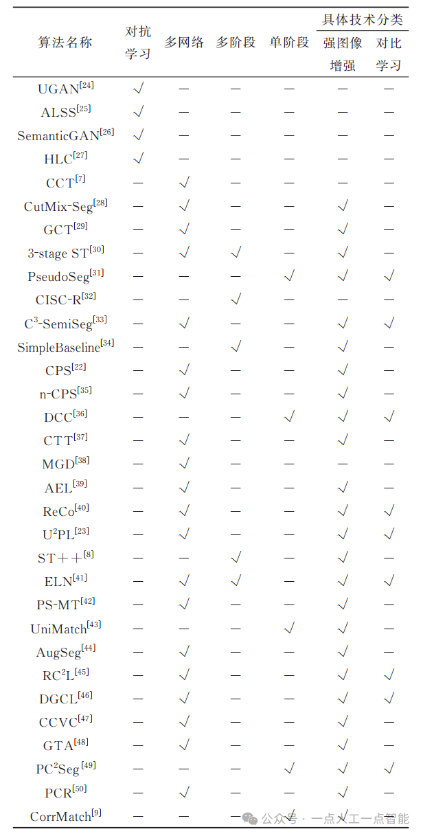 Teacher为例)由于多网络架构在训练过程中需同时维护多个可以接受独立输入的网络,因此非常适合一致性正则化(Consistency Regularization)的训练策略。该策略旨在提高模型对视角或输入变化的鲁棒性,核心思想为:同一数据样本的不同变换或视角以及不同神经网络本身的随机性,都不应该影响模型给出一致的输出。典型多网络架构的训练范式是要求不同网络对同一个数据样本的不同变换给出一致的预测,利用网络对不同难易程度数据的推理结果约束训练过程。基于多网络架构的半监督语义分割方法,对于无标签数据,一般包含弱图像增强和强图像增强2个分支。其中,弱图像增强一般与全监督语义分割中的数据增强相同,包括随机尺度、随机裁切和随机翻转;强图像增强则包括色彩抖动(ColorJitter)、随机灰度、高斯模糊等。一个理想状态下的网络对非语义层面的扰动应当是不敏感的,即网络对于弱图像增强数据和强图像增强数据应该给出一致的预测。由表2可知,使用强图像增强技术对输入数据进行扰动,已成为大部分半监督语义分割的通用方法。文献[28]指出,半监督语义分割任务需要更强、更多样化的扰动,例如CutOut、CutMix等复杂的图像增强技术。目前,CutOut、CutMix也已成为半监督语义分割方法中常用的强数据增强方式。AugSeg[44]方法为分析数据增强对半监督语义分割任务的影响,设置了一个包含多种数据增强方法的数据增强池,并在模型训练时从其中随机采样出特定数量的数据增强方法作用于图像,丰富了半监督语义分割任务中的数据增强方法。同时,AugSeg也提出了一种改进的CutMix方法,有效提升了模型性能。近年来,多网络架构已成为用于半监督语义分割任务的一种主流架构。这一架构利用无标签数据增强模型的泛化能力,进而提升模型整体的鲁棒性。很多方法都采用了这一基本范式,并在此基础上提出了新的思路。AEL[39]是使用Mean Teacher架构的典型方法,该方法关注到数据集中不同类的数据分布不同,通过设计置信度库(Confidence Bank)的方式动态跟踪训练过程中不同类别的性能,从而向预测性能较差的类进行倾斜,达到不同类别之间的平衡。C3-SemiSeg[33]方法专注于不同数据增强的图像在特征层面的对齐,并且据此提出一种区域级数据混合的图像增强技术。ReCo[40]方法使用对比学习技术,在已有编码器的基础上连接了一个辅助解码器,将输入特征映射到更高维度的表征空间。同时,该方法使用稀疏采样,仅对图像中小部分像素进行采样,通过所提出的对比损失函数,约束样本在表示特征空间中靠近正键,并远离负键。U2PL[23]方法同样使用对比学习方式,关注到模型预测时的可信度,通过筛选信息熵的方式将预测划分为可靠区域和不可靠区域。该方法指出,不可靠区域像素的混淆一般发生在具有相对高概率的类别之间,即该像素对于其不属于其他低概率类别有很强的信心。因此,U2PL方法将这些像素视为最不可能的类别负样本,从而提高了无标签数据的利用率。DGCL[46]方法也使用了Mean Teacher架构和对比学习结合的形式,设计了一个多尺度密度估计模块,从多个最近邻图中获取特征密度,并通过对比学习将稀疏区域中的特征向高密度正样本近似的簇中心推进,将这种几何正则化与模型训练结合起来,为无标签数据提供互补的监督。PCR[50]方法利用原型(Prototype)规范类内特征分布,鼓励模型的预测与基于Prototype的预测器的输出之间的一致性。GTA[48]方法在教师网络的基础上,引入助教网络(Gentle Teaching
