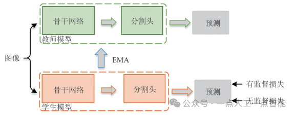 生成对抗网络(Generative Adversarial Networks, GANs)[51]提出一种利用神经网络间对抗学习进行模型训练的范式,已在多个领域得到广泛应用。同时,其生成的形式与对抗学习的性质也启发了一些使用深度学习进行半监督语义分割的方法。考虑到一般情况下,GAN的网络结构包括生成器(Generator)和鉴别器(Discriminator),本文将基于对抗学习的半监督语义分割模型细分为2类,即利用生成器的方法和利用鉴别器的方法。利用生成器的方法通常借助GAN网络中的生成器,生成新的合成图像,用作半监督语义分割模型的附加训练数据。一个典型的方法由文献[24]提出。该文认为添加大量虚假的视觉数据能够使真实样本在特征空间中接近,进而提高像素级分类的性能,所提方法使用生成器网络为多类鉴别器提供额外的训练数据,将样本分配给可能的类别或标记为伪造样本。随着GAN网络的发展,特别是StyleGANv2[52]的提出,图像生成的质量和精细程度得到了大幅提升。文献[26]提出一种新的基于对抗生成的半监督语义分割方法,进一步扩展了StyleGANv2模型,即通过增加一个标签合成分支试图捕捉图像和标签的联合分布,从而获得生成新图像-标签对的能力。基于鉴别器的方法没有直接使用生成器进行数据增广,而是借鉴了GAN的对抗训练范式。在2018年,文献[25]提出了一个标准范式:将分割网络的预测结果输入鉴别器,借助对抗训练的方式将其与真实标签之间进行区分并得到网络预测标签的逐像素置信度分布图;利用该置信度分布图,在无标签数据上标定出特定的区域,用于模型的训练过程。后续也有工作在该范式的基础上进行了改进,例如文献[27]提出一种双分支的训练方式,在保留对抗训练的基础上增加了一个半监督分类的分支,旨在利用类级的分类信息从分割结果中剔除错误的预测。然而,基于对抗学习的方法有明显的缺点,例如训练不稳定、训练成本高等,因此并非当下主流的半监督语义分割结构。随着基于CNN的语义分割方法不断发展以及半监督分类任务中对无标签数据利用方式的探索,在当下主流的半监督语义分割方法中,一种常见的方案是采用多网络架构(Multi-networks Architecture),即在训练过程中同时维护多个神经网络模型。其中,加权教师(Mean Teacher)架构[53]和对偶学生(Dual Student)架构[54]是代表性架构,以Mean Teacher为例的多网络架构见图1.Mean Teacher架构包含1个教师网络和1个学生网络,其中,教师网络的权重通过对学生网络权重进行指数移动平均(Exponential Moving Average, EMA)得到,不产生梯度。Dual Student结构则包含2个同时进行梯度下降的学生网络。图1 多网络架构(以Mean