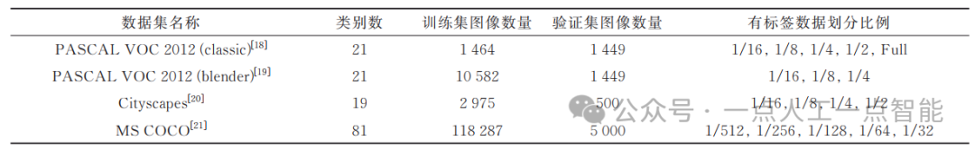 COCO数据集,初始化学习率一般设定为0.004,批次大小为16,共训练30个周期。在评价指标方面,与绝大多数全监督和半监督语义分割任务相同,使用平均交并比(mean
