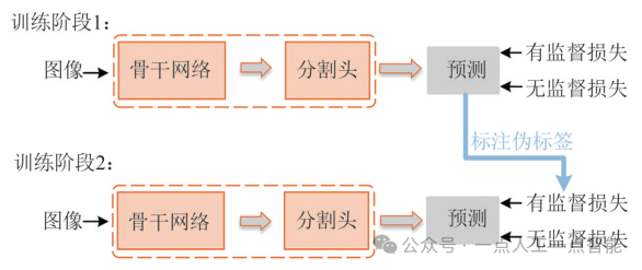 Student结构,使用2个结构相同但初始化不同的学生网络结构,鼓励2个网络在同时通过梯度下降更新参数的情况下,针对增强后的图像给出一致的输出。n-CPS[35]方法在CPS的基础上进一步发展,将双网络结构进一步拓展为多网络架构,通过多个网络间的一致性正则化,提高半监督语义分割的性能。GCT[29]方法在2个学生网络的基础上,增加了1个缺陷检测器,通过修正预测中缺陷的方式生成更高质量的伪标签,从而加强对无标签数据的监督。MGD[38]方法借鉴了知识蒸馏领域的方式,其训练框架包括2个结构上互补的教师网络和1个学生网络。对于无标签数据,除了使用来自2个教师网络的伪标签进行监督外,还针对每个教师网络分别设计了图像级语义损失和区域级上下文损失,从多个粒度进行监督。CTT[37]方法提出一种包含2个教师网络和2个学生网络的方案,其核心是一个跨教师网络一致性模块,即每个学生网络都受到来自另一个学生网络维护的教师网络的约束。此外,该方法还提出一种互补的对比学习策略:高层对比学习模块将高质量知识传递给无标签数据,并在特征空间中促进类别分离;而底层对比学习模块鼓励同级网络中的低质量特征从高质量特征中学习。利用多阶段架构(Multi-stages Architecture)进行模型训练是一种非常直观的利用无标签数据的学习范式,也是深度学习中一种常见的基础方法,多阶段架构见图2.在半监督语义分割任务中,其训练过程通常被分为2个阶段:①使用有标注的数据集训练一个初始模型,并使用该初始模型对无标签数据进行预测,得到伪标签(Pseudo Label);②将有标签数据和无标签数据合并为新的增强数据集,利用伪标签让模型进行有监督学习。这一范式旨在利用训练好的模型挖掘无标签数据上的有效知识,从而提升模型的效果。尽管这种范式简单而有效,但是其效果受限于第一阶段中初始模型的性能和第二阶段中生成的伪标签质量,一方面无法充分挖掘无标签数据中的信息,另一方面在第二阶段中错误的预测会在第三阶段训练中对模型造成误导,导致最终训练出的模型出现更多预测错误。这种现象被称为确信偏置(Confirmation Bias),是亟待解决的重要问题。3-stage ST[30]是一种典型的基于多阶段架构的自学习(Self-training)的方法。该方法在双阶段范式的基础上,增加了一个多网络架构训练阶段,该阶段在挖掘伪标签的丰富语义信息的同时保证数据扰动上的一致性。该方法同时利用Mean Teacher结构进行正则化,尝试将多网络和多阶段架构的优势集中到同一个模型中,提升其预测的伪标签的质量。SimpleBaseline[34]是一个更加简单的多阶段基线方法,把数据扰动和多阶段架构相结合,利用弱扰动数据下生成的伪标签对强扰动数据下得到的预测进行监督。该方法利用多轮迭代的方式,每一轮生成弱标签的模型都是上一轮被监督的模型,从而进一步提升伪标签的质量。此外,该方法还提出了分布特定的批标准化,以防止弱扰动和强扰动的数据分布对批标准化的混淆,使用反转交叉熵损失函数以缓解伪标签中的噪声对模型性能产生的影响。ST++[8]是在SimpleBaseline方法的基础上提出的更简单的基线方法,只需要3轮迭代就能达到足够好的效果:第一轮用有标签数据训练的模型生成伪标签,并利用训练中预测的稳定度作为标准选取质量较高的伪标签进行第二轮模型的训练;第二轮训练的模型会为所有无标签数据赋上伪标签,用于第三轮的训练。不同于以上尝试在无标签数据中挖掘更多信息的方法,CISC-R[32]专注于挖掘跨图像语义一致性(Cross-image Semantic