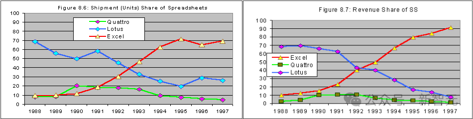 在Excel之前,VisiCalc就已经出现了,它可以被称为是计算机的第一个杀手级应用程序。它彻底改变了专业人士的工作方式,甚至变得如此重要,以至于人们会为了使用它而专门去买一台电脑。到20世纪80年代,各大公司更是为了电子表格的主导地位,展开了一场硝烟四起的争夺战。首先占据主导地位的,是IBM的Lotus-1-2-3。后来,在1985年,当微软发布Excel时,VisiCalc就遇到了最大的竞争对手。随着20世纪90年代Windows 3.0的发布,Excel成为了当之无愧的占主导地位的电子表格。