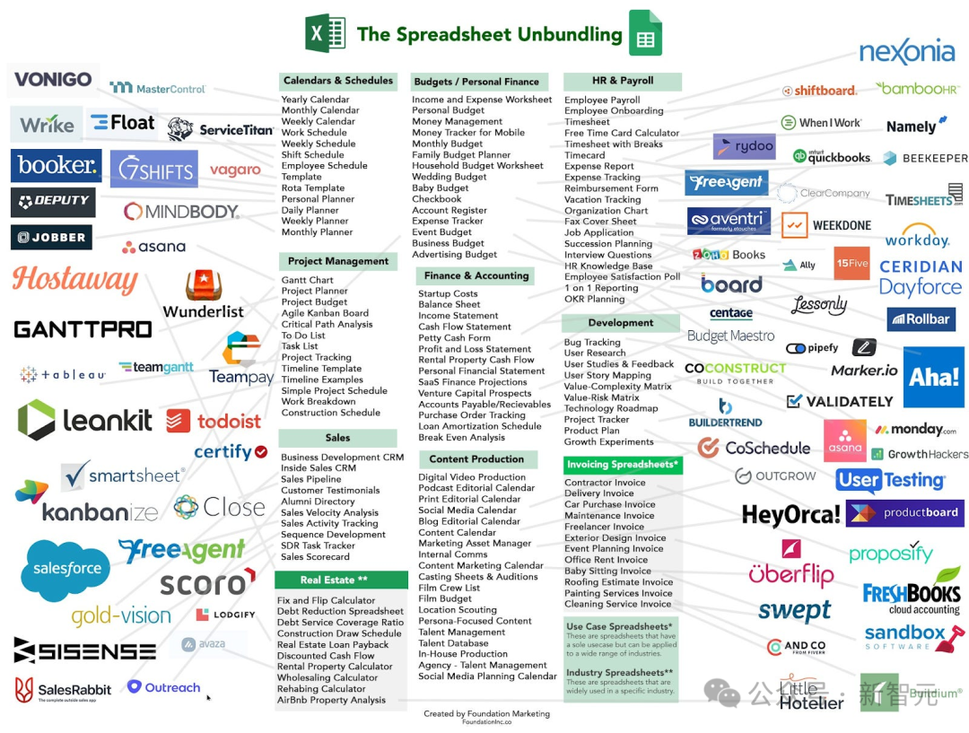 有了这些超能力,用户可以通过简单的电子表格的形式,创建功能齐全的软件程序。而这些程序,通常是特定领域应用程序的高保真原型,只不过后者会以更精致的形式推向市场。如果您想了解B2B软件的未来,请看看Excel用户今天在电子表格中进行了哪些操作。Excel的成功激发了软件开发的灵感。几十年来,Excel通过两种主要方式,为B2B软件行业制定了广泛的路线图,并将在未来几年继续使用:通过采用目前在Excel中完成的工作,并尝试在更优化、专门构建的 B2B 软件中完成该工作,已经有数百家B2B初创公司诞生了。然而,尽管Excel已「分拆」,但它仍然在变强大。富有冒险精神的开发者正在创建新软件,它不会拆分Excel,而是受到Excel的启发。自Excel诞生,三十年来创建的爆款无代码和低代码产品中,都可以找到Excel的可用性和灵活性之间的平衡。这种灵感来源不那么直接,它并不是要重现Excel中任何具体的事,而是要捕捉Excel如此成功的本质。Excel是地球上最流行的编程语言。