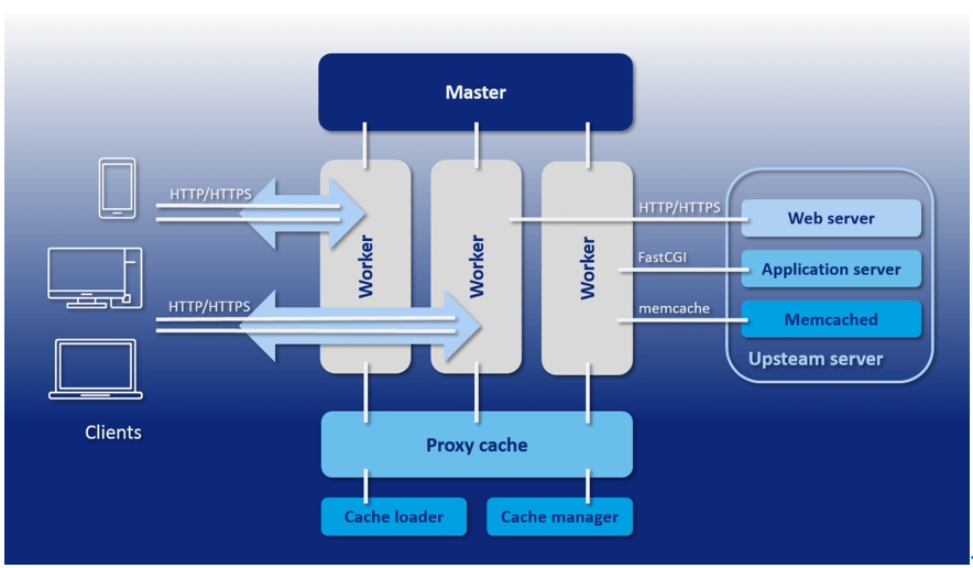 另外在Nginx架构中还有Cache Loader和Cache Manager进程,Cache Loader进程加载缓存索引文件信息;Cache Manager进程管理磁盘的缓存大小,超过预定值大小后最小使用的数据将被删除。