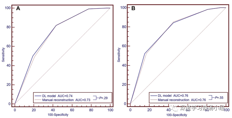 深度学习模型和手工重建的J-CTO评分均为优,95%总体置信区间分别为0.95、0.99(图4)。对于行介入治疗的患者,进行受试者操作特征曲线分析,初级放射科医师对比组(图5A)分别为0.74和0.73,高级放射科医师对比组(图5B)分别为0.76和0.76。