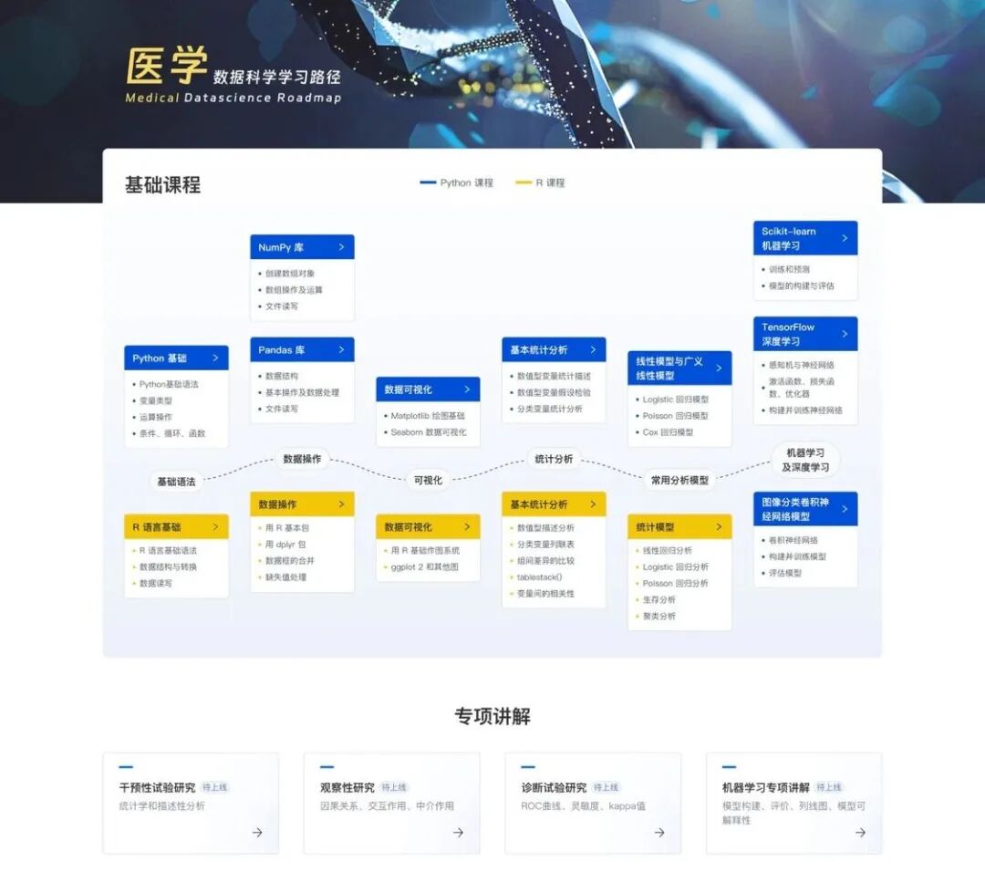 在当今的医疗健康领域,数据已经成为推动科学研究和临床实践的关键驱动力。然而,许多医疗工作者在面对复杂的数据分析任务时,往往感到无从下手,缺乏系统的学习和实践机会。这种技能的缺失不仅限制了医疗工作者在科研和临床中的表现,也阻碍了医疗行业整体效率和质量的提升。如何快速有效地掌握医学数据分析技能,成为摆在众多医疗专业人员面前的一大挑战。为此,和鲸社区制作了医学数据分析的系列活动,内容专为医学相关专业人员、学生设计,并且全部免费提供给大家学习。本系列活动支持 Python 和 R 两种语言,涵盖了编程语言基础、数据可视化、统计分析、机器学习与深度学习,以及临床预测模型的构建等多个方面。每套教程都结合了真实的医学数据和实战案例,确保你在学习过程中不仅可以系统地学习并掌握医学数据分析的核心知识,还可以获得实用的技能和经验。