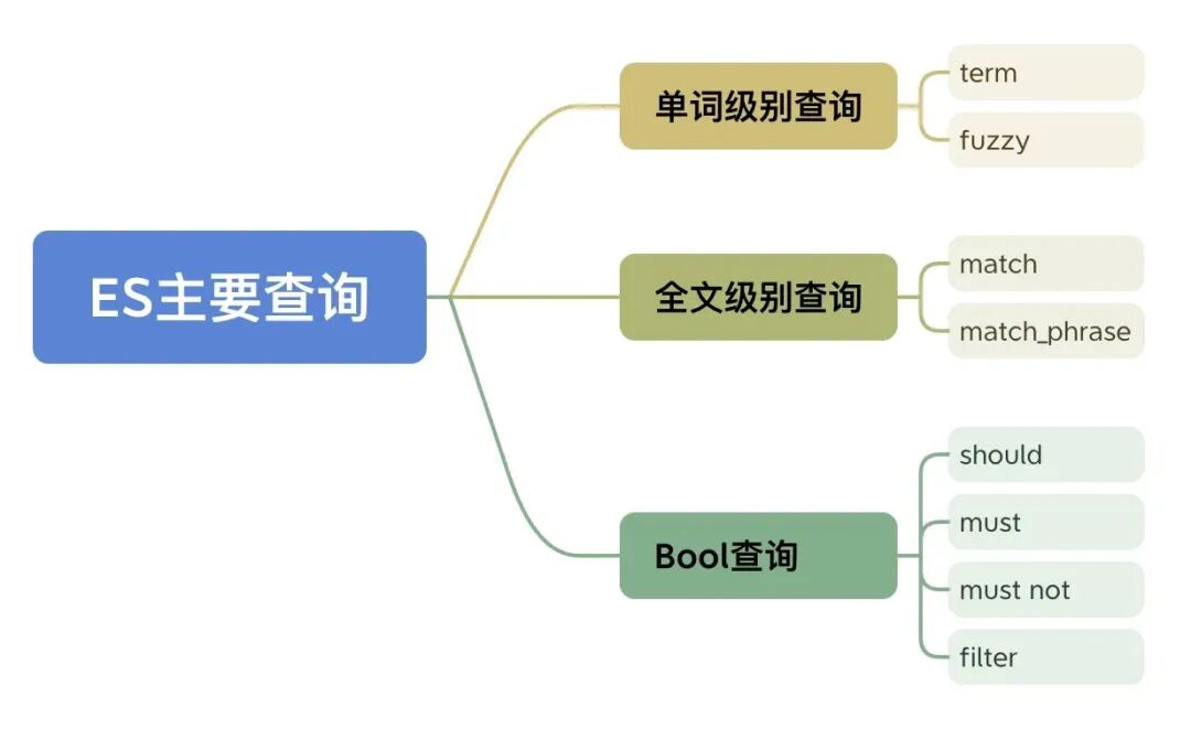 基于以上的核心概念,Elasticsearch通过分布式存储结构和分析检索能力,支持并提供了多种不同类型的查询能力,用于满足各种检索需求。以下是ES中主要的查询类型: