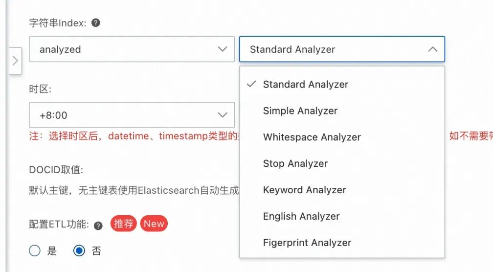 在阿里云DTS数据同步工具中,可以选择一系列ES内置的分析器,但是Elasticsearch的内置分析器对于中文的支持较差,采取了暴力拆分每个中文单字的策略。如果希望对中文进行合适的分词,可以选择第三方分词器,比如jieba分词器。