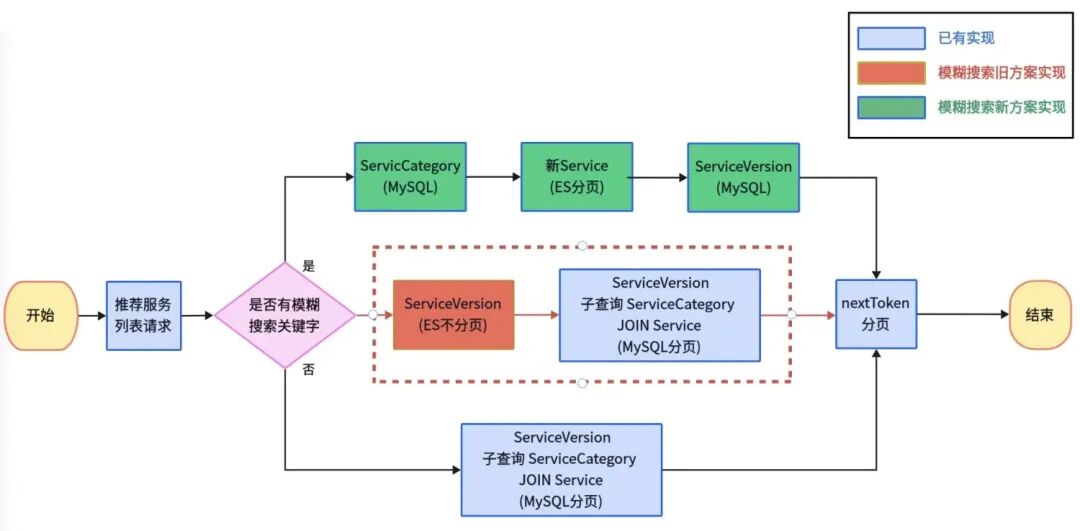 在上述项目中,一个API服务使用到了两条查询链路:一条纯MySQL的查询链路,另一条ES分页+MySQL补字段的查询链路。由于在ES分页中,我们已经手动复现了MySQL中的nextToken分页条件。因此,在查询结束后,封装nextToken分页请求的这部分后端逻辑就可以实现复用。如果MySQL基于自实现的nextToken分页而ES使用官方推荐的Sort分页,则复用性较差,需要两套分页逻辑。