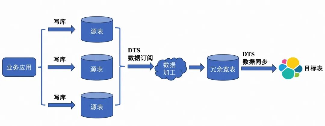 如果我们搭建一个中间层,将多表JOIN结果先写入一个冗余的MySQL宽表,再同步到ES,则数据同步可以使用简单高效的DTS。代价是整个同步链路环节增多,不稳定性增加了。
