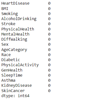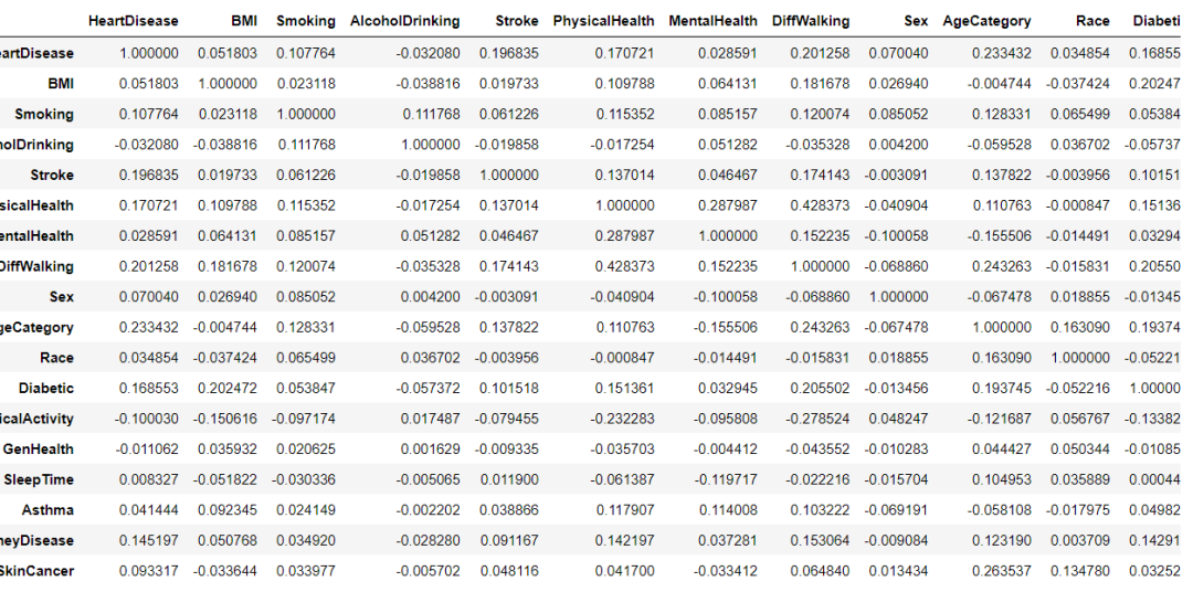 correlation=df.corr() correlation从上面的输出中,让我们分析一些与我们的目标(即心脏病)有关的变量。BMI=0.051803, smoking=0.107764, Alcohol drinking = -0.032080, Stroke = 0.196835, Physical Health = 0.170721, Mental Health = 0.028591, Age category = 0.233432, Diabetic = 0.168553, Physical activity = -0.100030, General Health = -0.011062, 和 Sleep time = 0.008327.