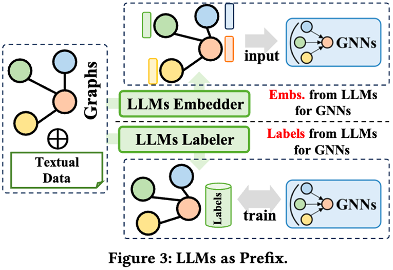 1. Embeddings from LLMs for GNNs: LLMs用于生成节点或图的初始嵌入,这些嵌入捕获了节点的语义信息,可以作为GNNs的输入或与GNNs生成的嵌入相结合,以提高图学习任务的性能。