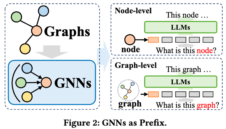 在大语言模型与图学习任务的结合中,一种创新的方法是将图神经网络作为信息处理的前置步骤,即“GNNs as Prefix”。这种方法充分发挥了GNNs在捕捉和理解图结构方面的优势,为后续的LLMs处理提供了结构化和语义丰富的输入。GNNs之所以被选为前缀,是因为它们天生适合处理图结构数据。GNNs通过聚合邻居节点的信息来更新每个节点的表示,能够很好地捕捉节点的局部结构特征。在“GNNs as Prefix”框架下,GNNs首先对图数据进行编码,生成节点或图的嵌入表示。这些嵌入随后作为输入特征提供给LLMs,使得LLMs能够利用其强大的语言理解能力来处理图相关的任务。具体实现可以分为两个子类: