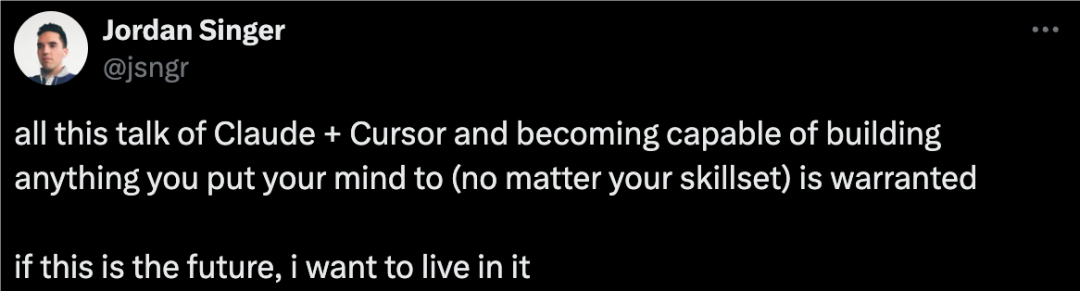 Figma 的 Jordan Singer 也加入了讨论,他说:“所有关于 Claude 加上 Cursor 的讨论,还有这些工具怎么能让你不管技术水平如何,都能根据自己的想法去构建任何东西,这些都是有道理的。如果这就是未来,那我想马上就到未来。”