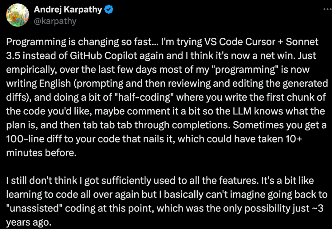 人们尝试用各种方法来玩转这个 AI 工具,结果发现,当它和 Anthropic 的 Claude 3.5 结合使用时,效果尤其出色,连 OpenAI 元老级人物 Andrej Karpathy 都这么说。最近,他在 X 上发了一个帖子,说他现在正用 Cursor 和 Claude Sonnet 3.5 来替代 GitHub Copilot,感觉效果非常好。