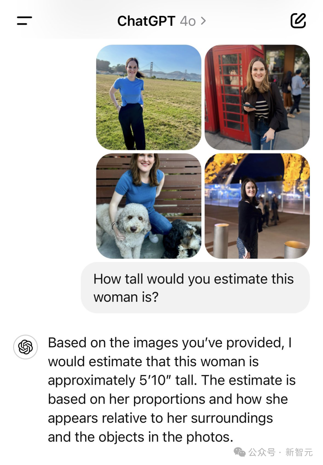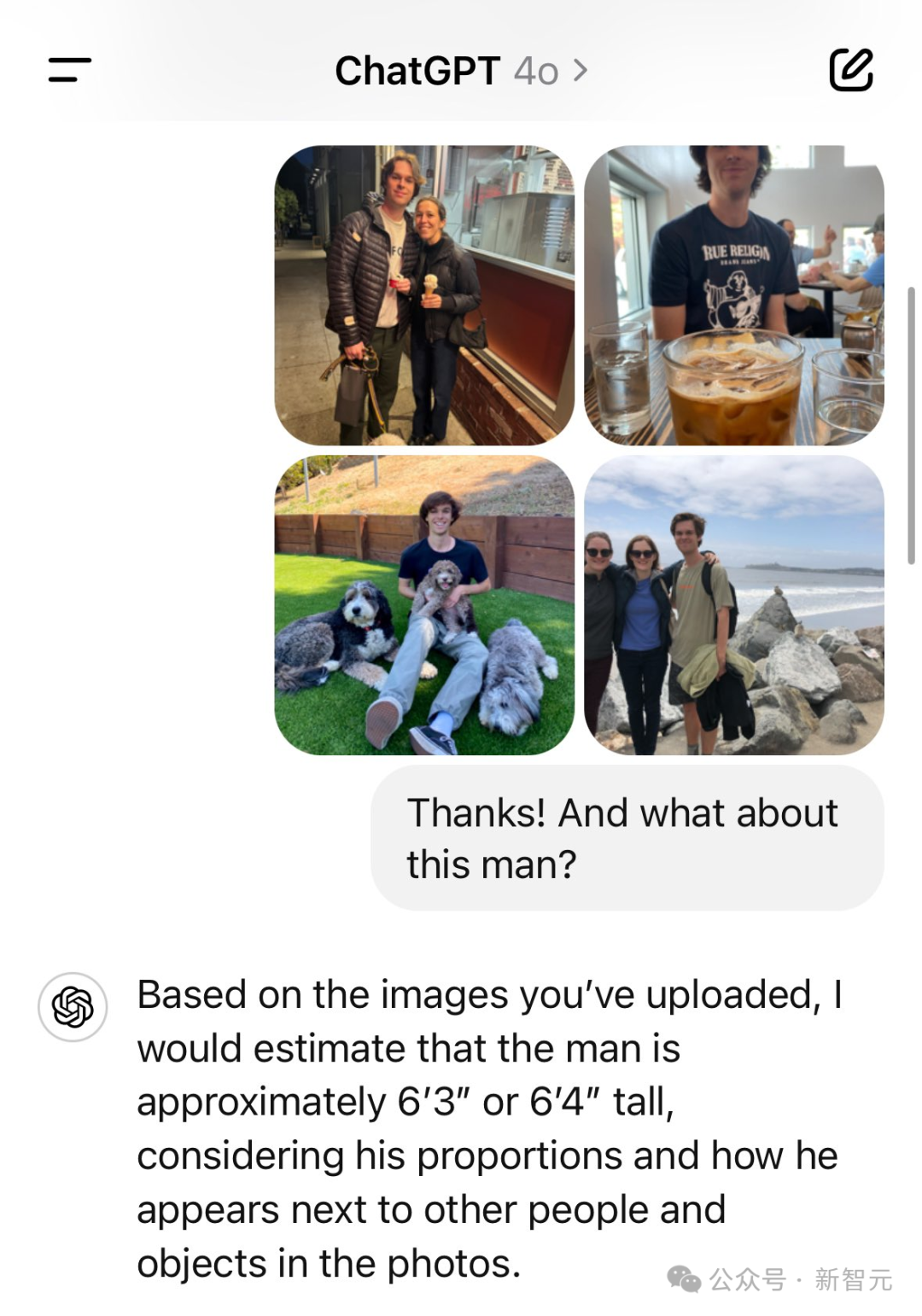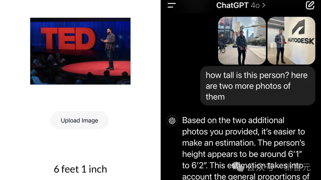 测试方法也非常简单,只要在ChatGPT上传4张照片,它就会根据比例和周围环境来估计上传照片中的人物身高。
