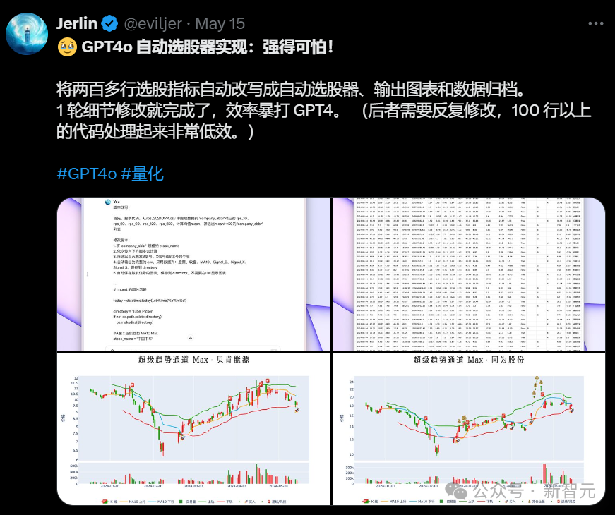 网友用GPT-4o将两百多行选股指标改写成了自动选股器,并输出图表,归档数据,经过一轮细节修改就完成了。