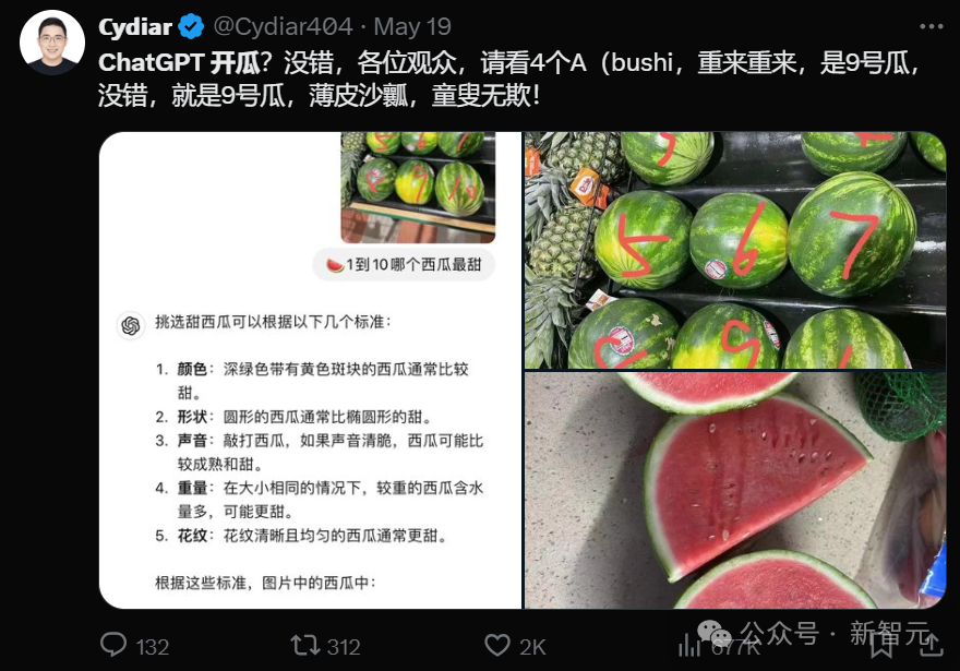 网友还发现还能用ChatGPT挑选西瓜,让买水果不再听商家忽悠和开盲盒,轻松挑到「报恩」西瓜。