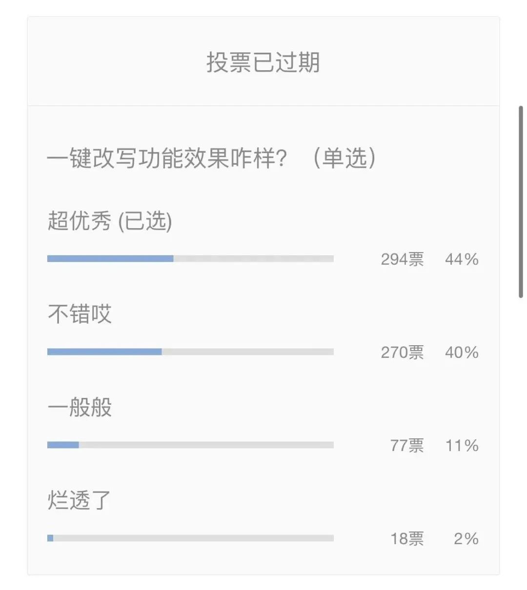 应该说改写的效果是相当不错的,这也难怪之前的公测,大家打出了84%满意的高分(近一半44%的同学认为超优秀,40%认为不错)。