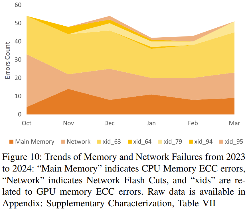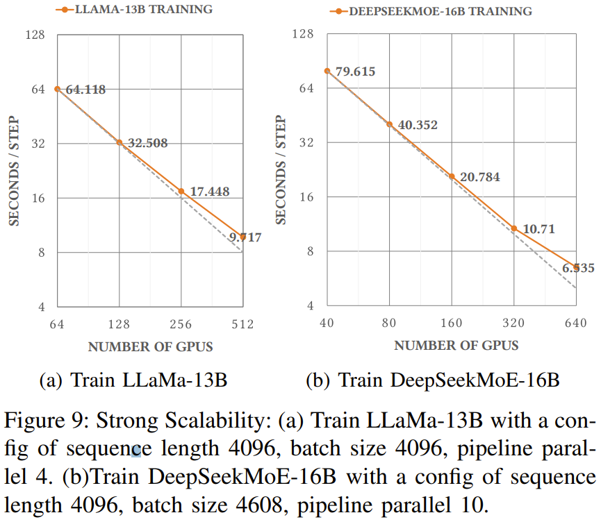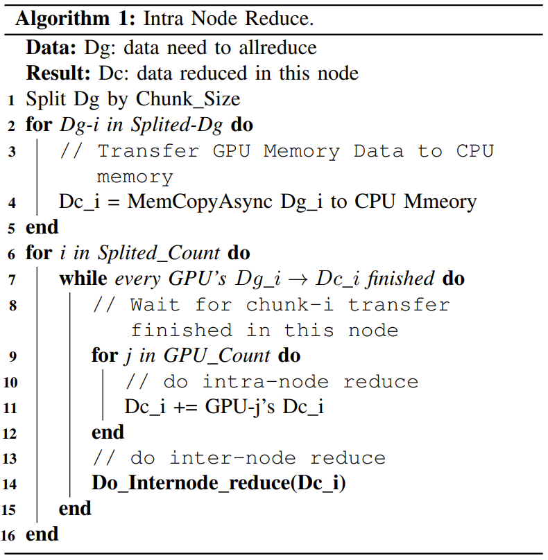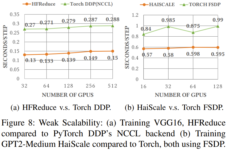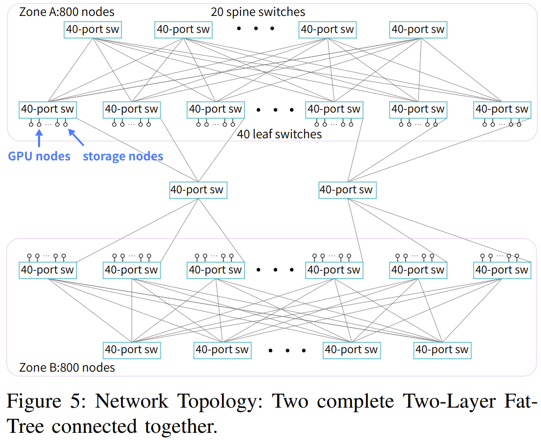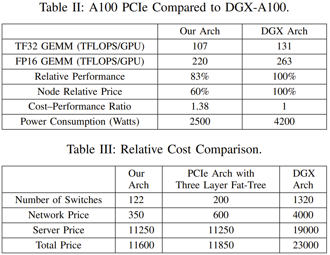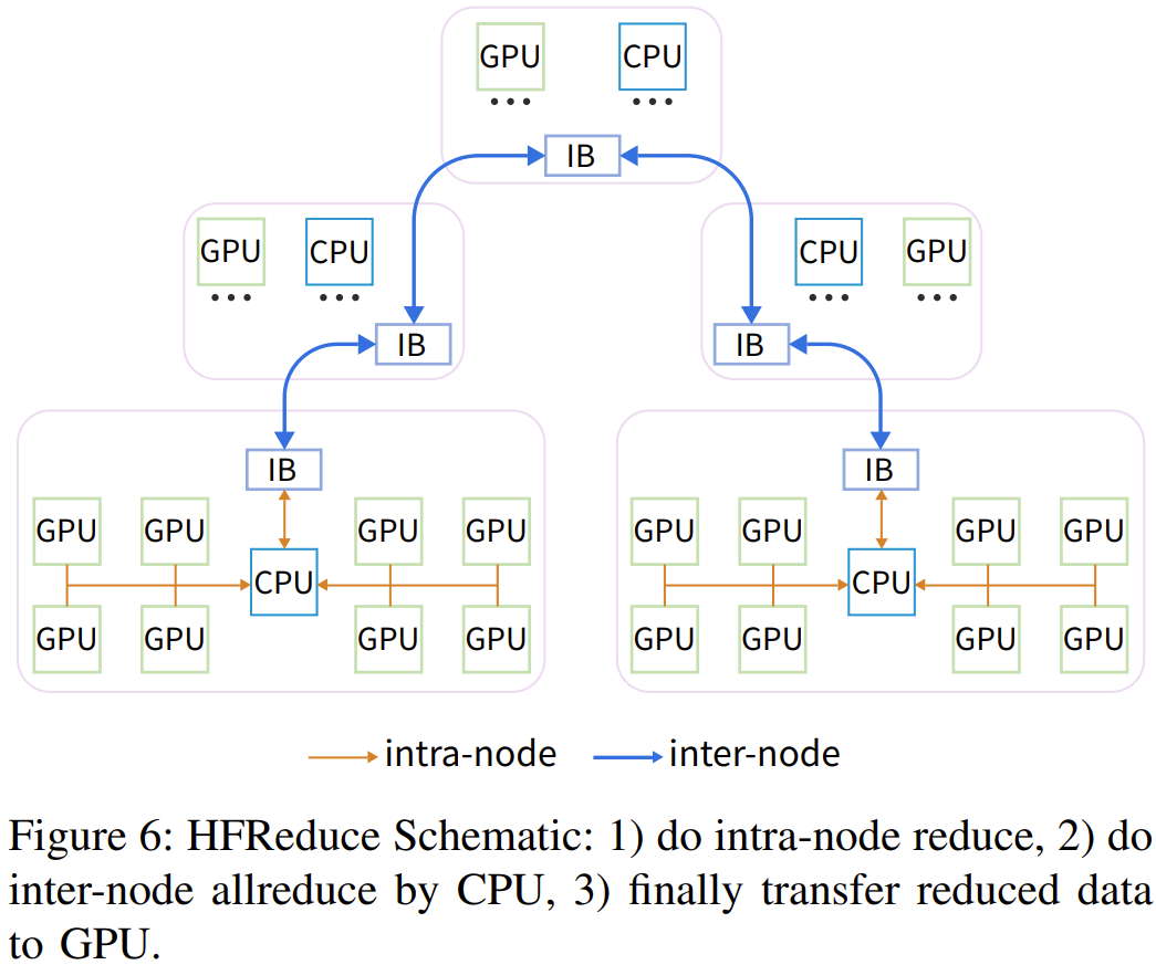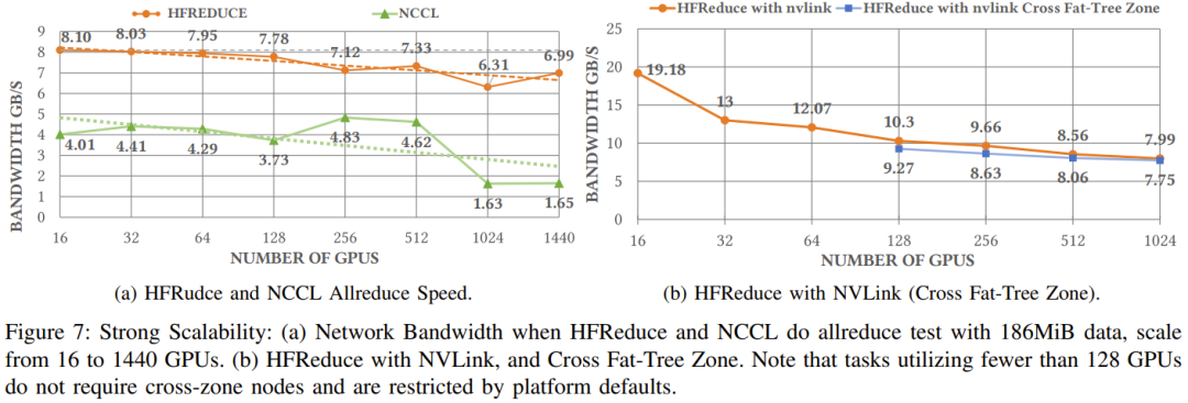 之后,随着 LLM 时代的到来,该团队也在 PCIe 卡之间添加了 NVLink Bridge。网络拓扑:整合了存储和计算的两层 Fat-Tree他们选择的拓扑结构是 Fat-Tree,原因是它具有极高的对分带宽。网络连接解决方案则是 InfiniBand。具体来说,他们使用了 Mellanox QM8700 InfiniBand 交换机,其提供了 40 个速度 200 Gbps 的端口。整体而言,该集群由 1 万台 A100 GPU 构成,包括约 1250 个 GPU 计算节点和近 200 个存储服务器,尽管双层 Fat-Tree 最多可以容纳 800 个节点(配置 20 个脊交换机和 40 个叶交换机)。为了降低成本,他们选择了两区网络配置而不是三层 Fat-Tree 解决方案,如图 5 所示。每个计算区都包含一个 800 端口的 Fat-Tree,并连接到了大约 600 个 GPU 计算节点。每台存储服务器配备两个 IB 网卡,分别连接到不同的区,因此所有 GPU 计算节点可以共享一组存储服务。此外,这两个区会通过有限数量的链路互连。他们的 HAI Platform 调度策略确保跨区计算任务最多限制为一个。无论是使用 NCCL 还是 DeepSeek 内部开发的通信库 HFReduce,都可以通过使用双二叉树算法跨区运行。其调度器可确保在此拓扑中,只有一对节点跨区通信因此,即使有任务需要用到所有节点,也能在 Fire-Flyer 2 AI-HPC 上高效运行。在 TF32 和 FP16 GEMM 基准上,相比于英伟达 DGX-A100 架构,DeepSeek 设计的这套架构的计算性能为前者的 83%。但是,其成本和能耗的下降幅度要大得多,仅为前者的 60%,如表 2 所示。DGX-A100 集群使用了三层 Fat-Tree,其中包含 320 台核心交换机、500 台脊交换机和 500 台叶交换机,总共 1320 台交换机(如表 3 所示),而 DeepSeek 的这个架构只需要 122 台交换机。这样的设计具有更高的成本效益。此外,通过使用 800 个端口的 Frame 交换机,还能进一步降低光模块和线缆的成本。虽然由于 PCIe 卡规格和 SXM 之间的固有差异而存在性能差距,但 DeepSeek 的这一架构通常能以仅 60% 的成本实现 80% 的 DGX-A100 性能!此外,他们还将能耗降低了 40%,也由此降低了二氧化碳排放。从这些指标看,这一架构设计无疑是成功的。有了高效的硬件,也自然需要适配的软件。该团队开发了一个用于高效 allreduce 运算的软件库:HFReduce。HFReduce 的核心策略见图 6,其包括节点内(算法 1)和节点间(算法 2)的 reduce。HFReduce 相较于 NCCL 的优势有两项:如图 7a 所示,在 Fire-Flyer 2 AI-HPC 上执行数据大小为 186 MiB 的 allreduce 时,HFReduce 可以达到 6.3-8.1GB/s 的节点间带宽,而 NCCL 的节点间带宽仅为 1.6-4.8GB/s。另外,还能使用 NVLink 提升 HFReduce 的性能。通过安装 NVLink Bridge,可通过速度 600 GB/s 的 NVLink 实现成对 GPU 间的高效通信。为了缓解原 HFReduce 的内存限制问题,他们还实现了另一种 allreduce 模式,称为 HFReduce with NVLink。其核心概念是先在通过 NVLink 互连的 GPU 之间执行 reduce 操作,再将梯度传递给 CPU。随后,当 CPU 返回结果时,它会拆分结果数据并将它们分别返回给通过 NVLink 连接的配对的 GPU,然后通过 NVLink 执行 allgather。如图 7b 所示,HFReduce with NVLink 实 现了超过 10 GB/s 的节点间带宽。有关 HFReduce 的策略和瓶颈的更多深度分析请参阅原论文。HaiScale:针对深度学习模型训练进行特别的优化HaiScale 分布式数据并行(DDP)是一种以 HFReduce 为通信后端的训练工具。这类似于 Python 的以 NCCL 为后端的 DDP。在反向传播阶段,HaiScale DDP 会对计算出的梯度执行异步 allreduce 操作,允许此通信与反向传播中涉及的计算重叠。如图 8a 所示,相较于使用 Torch DDP 的 NCCL 后端,使用 HFReduce 训练 VGG16 模型所需的时间仅为前者的一半,当 GPU 数量从 32 增至 512 时可实现近 88% 的并行可扩展性。为了训练大型语言模型(LLM),HaiScale 框架采用了多种并行策略,类似于 Megagron 和 DeepSpeed。他们针对 PCIe 架构在数据并行(DP)、管道并行(PP)、张量并行(TP)、专家并行(EP)等方面进行了特定的工程优化。1. 使用 NVLink Bridge 实现 PCIe GPU 之间的张量并行图 8 和 9 展示了这些优化策略的一些实验结果。可以看到,随着 GPU 数量增长,这些策略能带来非常好的可扩展性。此外,该团队还在论文中分享了更高级的成本效率和联合设计优化方法,其中包括一些降低计算 - 存储整合网络中信息拥堵的方法、高吞吐量分布式文件系统 3FS 以及一个时间共享式调度平台 HAI Platform。最后,他们验证了这整套设计的稳定性和稳健性。下图总结了他们在 2023-2024 年遇到的内存和网络故障趋势。总体而言,Fire-Flyer 2 AI-HPC 在成本性能上表现优秀 —— 能以 60% 的能源消耗达到英伟达 DGX-A100 计算性能的 80%。当进行大规模训练时,其能带来的整体成本效益将非常可观。如果你也打算构建自己的大规模训练集群,不妨考虑一下这套架构。