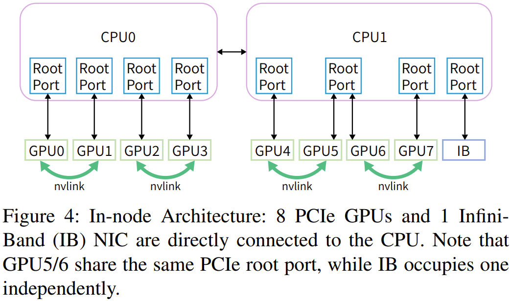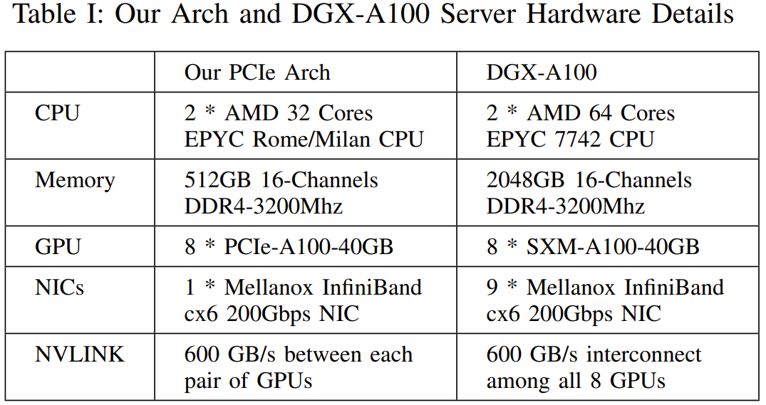 具体来说,该团队基于 Fire-Flyer AI-HPC 架构部署了一个包含 1 万台 PCIe A100 GPU 的计算集群。下表比较了该集群与英伟达的 DGX-A100 的硬件参数。Fire-Flyer 2:支持深度学习和早期 LLM 训练如图 3 所示,LLM 的内存需求量通常比较大。相较之下,其它模型的需求就小多了。ResNet、Mask-RCNN、BERT、MAE 等常用模型的参数量均少于 1B,这说明其内存需求较低。因此,在设计用于深度学习模型训练的集群时,使用 PCIe A100 GPU 可能就已经足够了。Fire-Flyer 2:PCIe A100 GPU 架构基于该团队的训练工作负载,使用单个 200Gbps 的 NVIDIA Mellanox ConnectX-6 (CX6) InfiniBand (IB) 网卡就能满足 8 台英伟达 PCIe A100 GPU 的存储 IO 和计算通信的带宽需求。他们使用了如图 4 所示的计算节点架构: