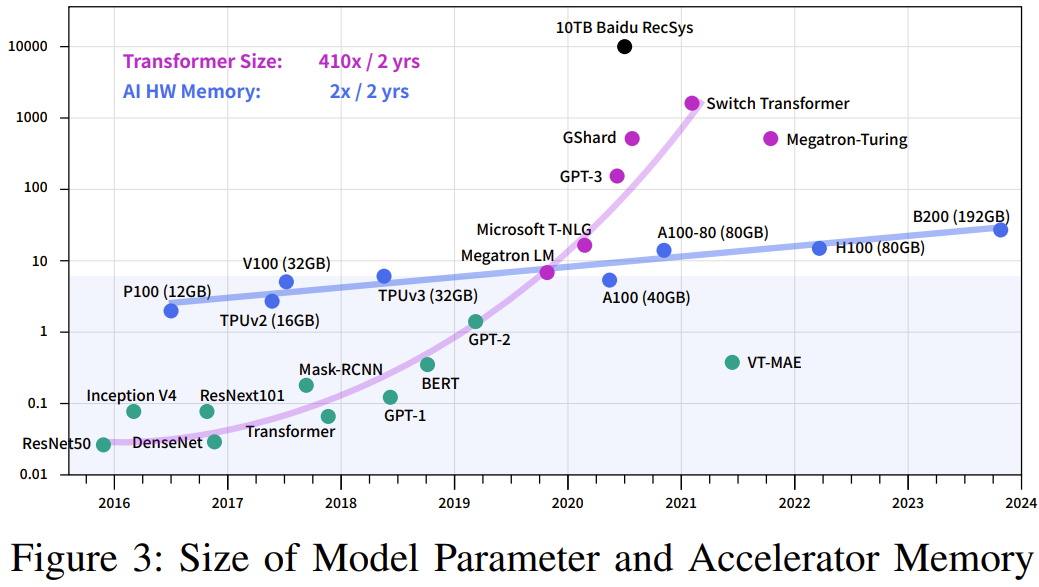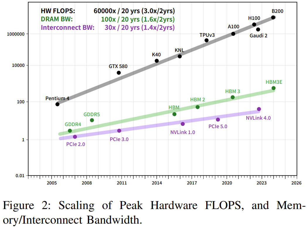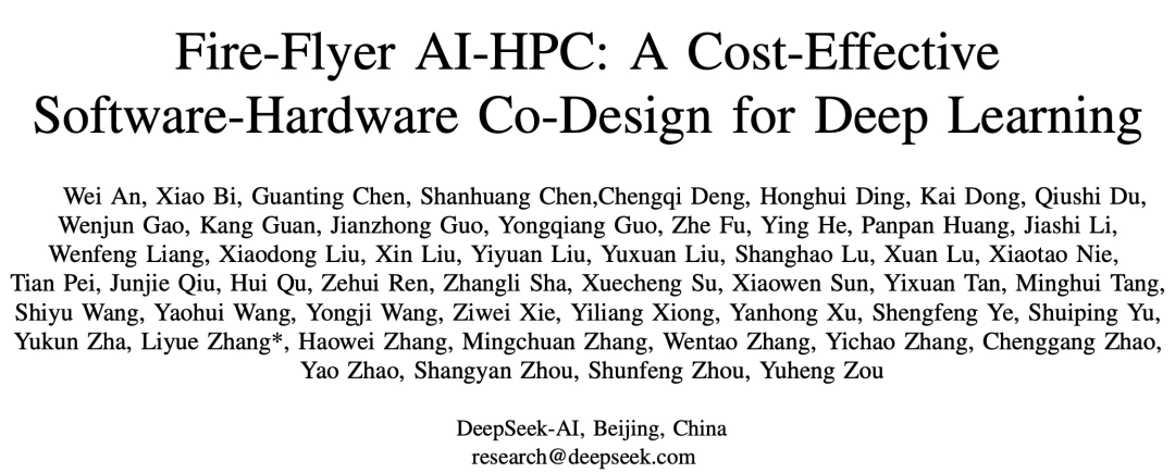 根据摩尔定律,计算机的速度平均每两年就会翻一倍,但深度学习的发展速度还要更快,如图 1 和 2 所示。可以看到,AI 对算力的需求每年都以 10 倍幅度增长,而硬件速度每两年增长 3 倍、DRAM 带宽增长 1.6 倍、互连带宽则仅有 1.4 倍。而大模型是大数据 + 大计算的产物,其参数量可达千亿乃至万亿规模,需要成千上万台 GPU 才能有效完成训练。这些实际情况提升了人们对高性能计算(HPC)的需求。为了获得更多计算资源,人们不得不扩展更多计算节点。这就导致构建 AI 基础设施的成本不断激增。降低这些成本具有很大的好处,构建成本和能耗高效型计算机集群也就自然成了一个热门的研究方向。近日,DeepSeek(深度求索)发布了一份基于硬件发展的实际情况及其多年实践经验的研究成果,其中提出了一些用于构建用于深度学习和 LLM 的 AI-HPC 系统的成本高效型策略。- 论文标题:Fire-Flyer AI-HPC: A Cost-Effective Software-Hardware Co-Design for Deep Learning