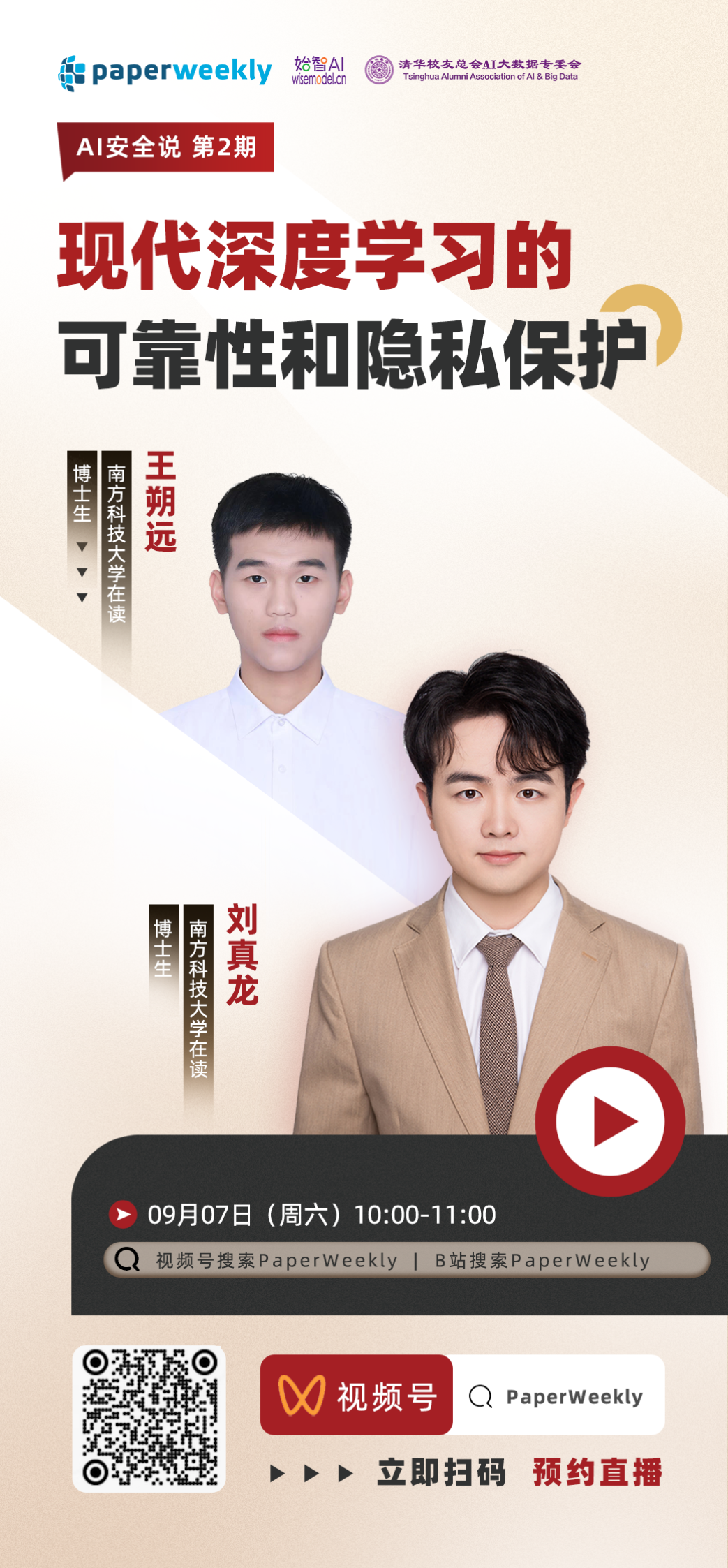 嘉宾介绍 王朔远,南方科技大学在读博士生,其导师是魏鸿鑫教授。他的研究重点是为 AI 基础模型开发可信的机器学习方法,譬如机器学习模型分布外泛化和置信度校准研究,并在 ICML,Ubicomp 等顶级国际会议上发表了多篇高水平论文。目前,他致力于视觉语言模型的置信度校准研究,为基础模型的安全应用提供更加可靠的保障。