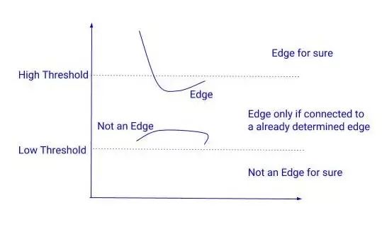 在这两个阈值之间有梯度的像素会被检查,如果它们和边缘相连,就会留下,否则就会去掉。