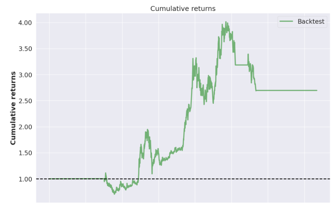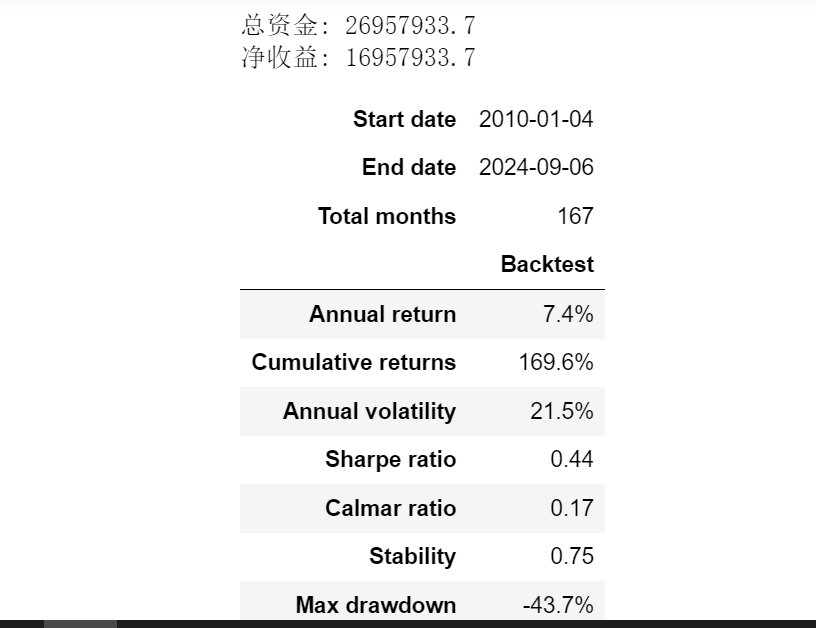 下面是买入持有中国平安在回测期间的回测表现。从回测结果来看,在回测期间内其价格突破策略优于简单的买入持有。