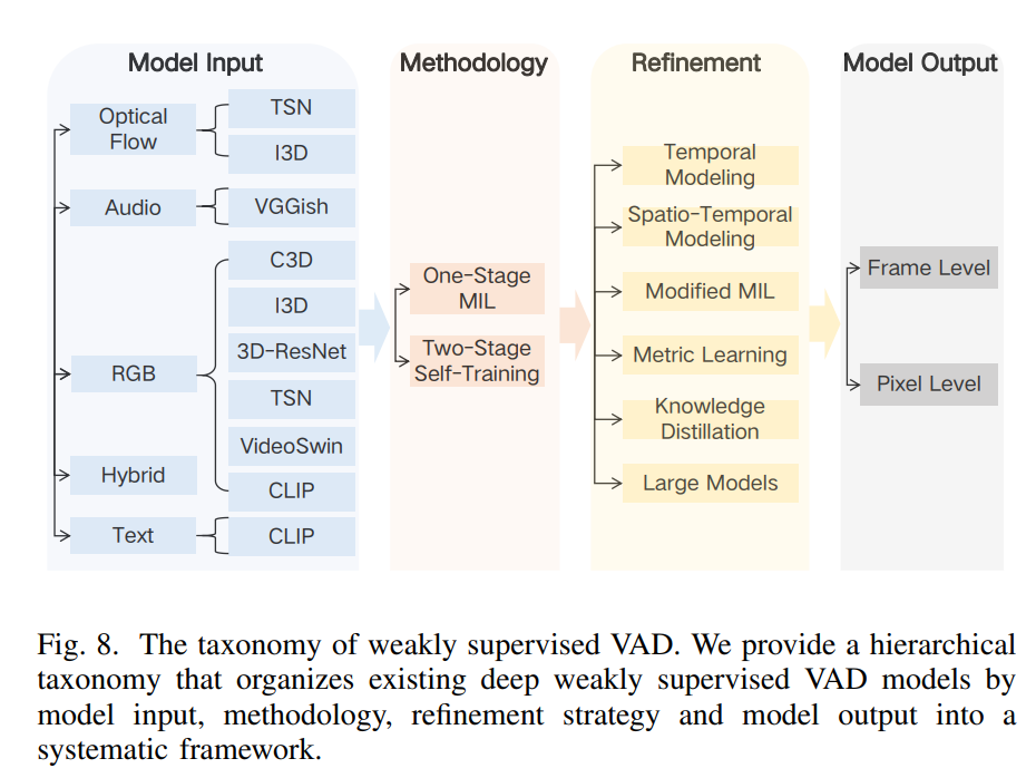 弱监督视频异常检测 (VAD) 是当前 VAD 领域中备受关注的研究方向,其起源可追溯到 DeepMIL【5】。相比于半监督 VAD,这是一个较新的研究方向,因此现有的综述缺乏全面而深入的介绍。如表 I 所示,Chandrakala 等人【12】和 Liu 等人【13】都提到了弱监督 VAD 任务。然而,前者仅简要描述了 2018 至 2020 年间的一些成果,而后者尽管涵盖了近期的工作,却缺乏科学的分类体系,仅根据不同的模态将其简单地分为单模态和多模态。鉴于此背景,我们从 2018 年至今调查了相关工作,包括基于预训练大模型的最新方法,并从四个方面对现有工作进行了分类:模型输入、方法论、优化策略和模型输出。弱监督 VAD 的分类体系如图 8 所示。