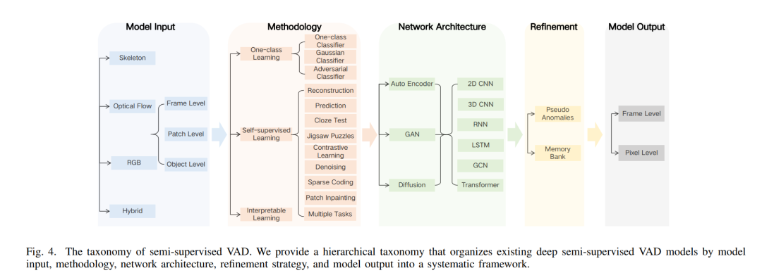 如前所述,在半监督 VAD 任务中,只有正常样本可用于训练,这使得监督分类范式不可适用。常见的方法是利用训练样本的内在信息,学习深度神经网络 (DNN) 来解决前置任务。例如,正常性重建是一个经典的前置任务【3】。在此过程中,需要考虑几个关键方面:样本信息的选择(模型输入)、前置任务的设计(方法论)、深度网络的利用(网络架构)、方法的改进(优化)和异常结果的表达(模型输出)。这些关键要素共同决定了半监督 VAD 解决方案的有效性。在接下来的章节中,我们将根据上述分类体系系统地介绍现有的基于深度学习的 VAD 方法。
