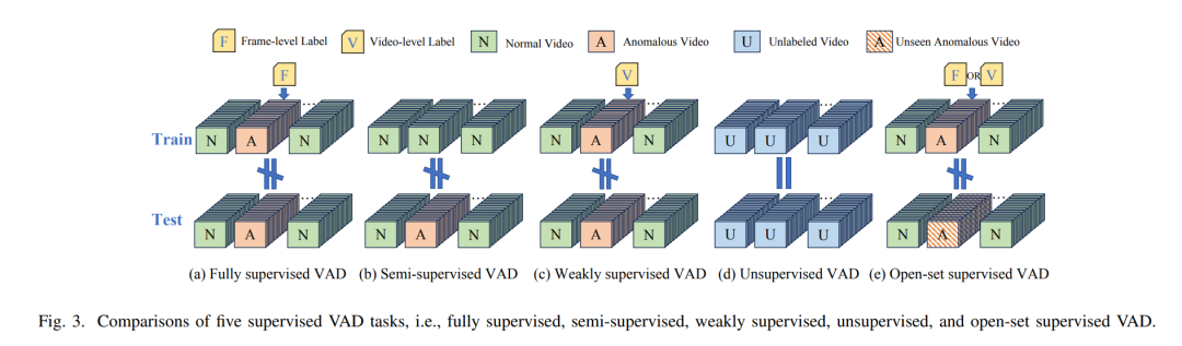 - 我们对 VAD 进行了全面综述,涵盖了基于不同监督信号的五种任务,即半监督 VAD、弱监督 VAD、全监督 VAD、无监督 VAD 和开放集监督 VAD。研究重点已经从传统的单任务半监督 VAD 扩展到了更广泛的多任务 VAD。