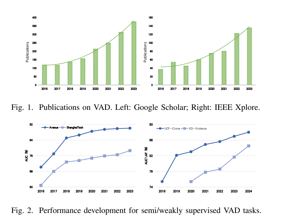 在过去十年中,随着深度学习的崛起,传统的机器学习算法逐渐失去了吸引力。随着计算机硬件的快速发展以及互联网时代大量数据的涌现,近年来基于深度学习的方法在 VAD 领域取得了显著进展。例如,ConvAE【3】作为第一个基于卷积神经网络 (CNN) 的深度自编码器,首次用于捕捉视频中的规律;FuturePred【4】首次利用 U-Net 预测未来的异常;DeepMIL【5】是第一个探索用于现实世界异常的深度多实例学习 (MIL) 框架的工作。为了更直观地展现深度学习时代对 VAD 任务的研究热情,我们通过 Google Scholar 和 IEEE Xplore1 对过去十年中与 VAD 相关的出版物数量进行了统计调查(这个时期由基于深度学习方法的崛起所驱动)。我们选择了五个相关主题,即视频异常检测、异常事件检测、异常行为检测、异常事件检测和异常行为检测,并在图 1 中展示了出版物统计数据。不难看出,从这两个来源统计的相关出版物数量呈现出稳步快速增长的趋势,表明 VAD 已经引起了广泛的关注。此外,我们还展示了在两种常见监督方式下常用数据集上年度最先进方法的检测性能趋势,并在图 2 中呈现了性能趋势。检测性能在所有数据集上均表现出稳步上升的趋势,未显示出任何性能瓶颈。例如,CUHK Avenue【6】上的半监督方法性能在过去七年间显著提升,从 70.2% AUC【3】上升到 90.1% AUC【7】。此外,针对后续提出的弱监督 VAD,研究也取得了显著进展。这表明,随着架构的发展,深度学习方法的能力不断提升,同时也展示了对 VAD 任务中深度学习方法的持续探索热情。