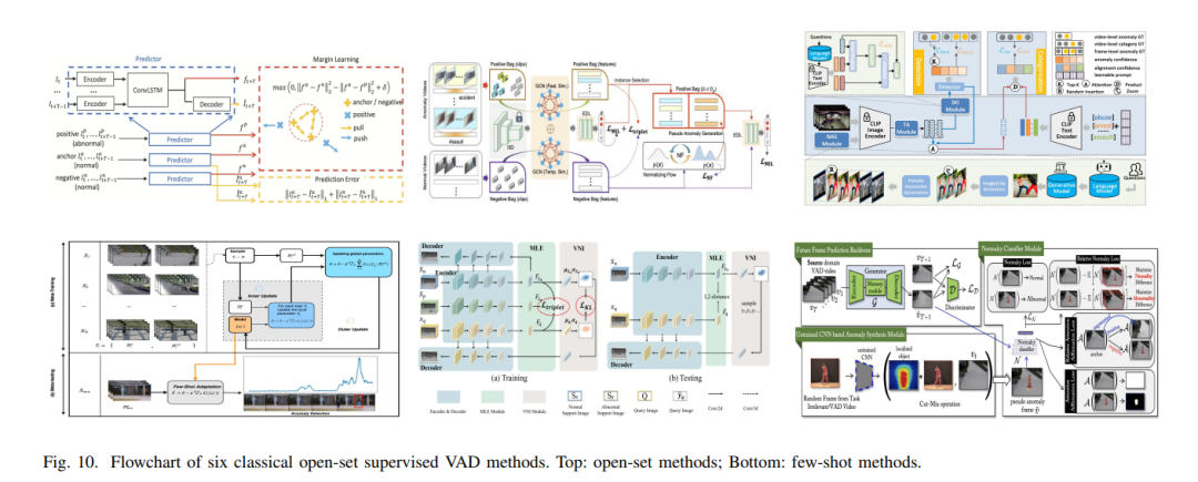 让经过充分训练的监督模型在开放环境中检测未见过的异常是一项具有挑战性的任务。在现实场景中,未见过的异常很可能会出现,因此,关于开集异常检测的研究引起了广泛关注。开集监督视频异常检测 (VAD) 是一项具有挑战性的任务,其目标是在训练阶段未见过的异常事件中进行检测。与传统的(闭集)VAD 不同,传统 VAD 中的异常类型是已知且定义明确的,而开集 VAD 必须处理不可预见和未知的异常。这对现实世界的应用至关重要,因为在训练过程中预见并标注所有可能的异常是不现实的。因此,开集 VAD 的研究引起了极大的关注。然而,现有的综述工作并未对开集 VAD 进行深入研究。基于此,我们进行了深入的调查,并对现有的开集 VAD 工作进行了系统分类。据我们所知,这是第一个包含详细介绍开集监督 VAD 的综述。在本节中,我们根据不同的研究方向,将开集监督 VAD 大致分为两类:开集 VAD 和小样本 VAD。在图 10 中,我们展示了六种经典的开集监督 VAD 方法。