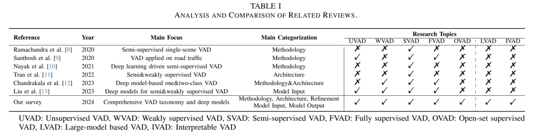 上述统计数据清楚地表明,深度学习驱动的 VAD 是当前研究的热点。因此,迫切需要对现有工作进行系统分类并进行全面总结,以便为新手提供指导并为现有研究人员提供参考。基于此,我们首先收集了近年来一些高影响力的 VAD 综述,见表 I。Ramachandra 等人【8】主要聚焦于单一场景下的半监督 VAD,缺乏对跨场景的讨论。Santhosh 等人【9】回顾了针对道路交通场景中实体的 VAD 方法。其综述缺乏足够的深度分析,主要关注 2020 年之前的方法,忽略了最近的进展。Nayak 等人【10】对基于深度学习的半监督 VAD 方法进行了全面调查,但未考虑弱监督 VAD 方法。随后 Tran 等人【11】介绍了新兴的弱监督 VAD 综述,但其重点不仅限于视频,还涉及图像异常检测,导致对 VAD 任务的系统性组织不足。最近,Chandrakala 等人【12】和 Liu 等人【13】构建了涵盖多种 VAD 任务的分类体系,例如无监督 VAD、半监督 VAD、弱监督 VAD 和全监督 VAD,并对大多数监督 VAD 任务的深度学习方法进行了综述。然而,他们的研究范围局限于传统的闭集场景,未涵盖最新的开放集监督 VAD 研究,也未引入基于预训练大模型和可解释学习的全新框架。