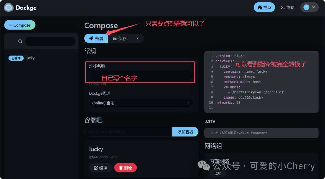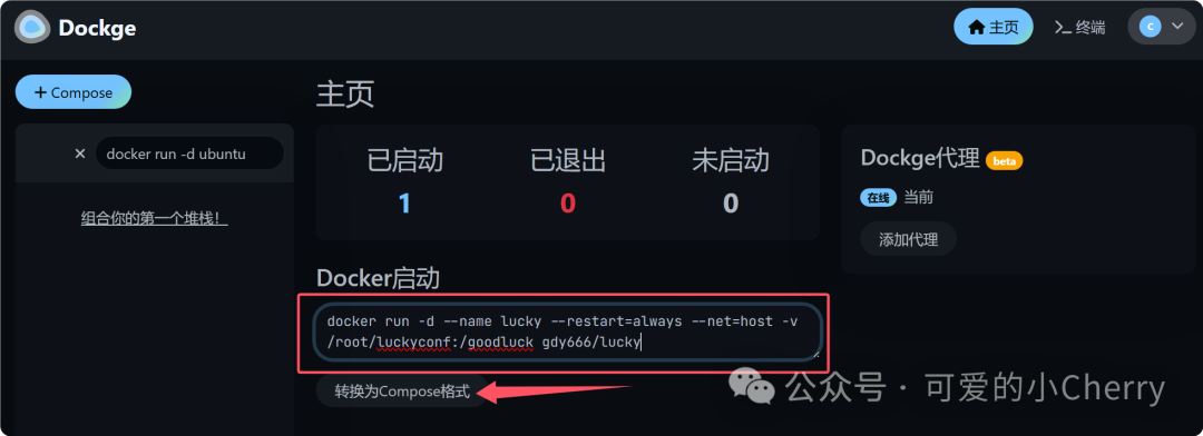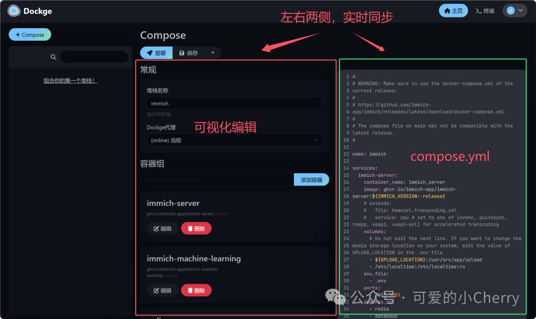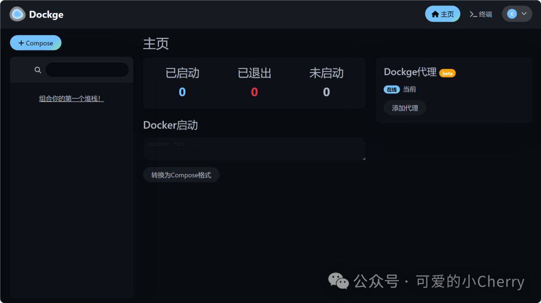 - 🧑💼 管理您的`composite.yaml`文件 - 开始/停止/重新启动/删除 - 更新Docker映像- ⌨️ ️用于`composite.yaml`的编辑器- 🦦 交互式Web终端- 🕷️ (v1.4.0) 支持多个代理-您可以在一个界面中管理来自不同Docker主机的多个堆栈- 🏪 转换`docker run.` 命令进入`composite.yaml`- 📙 Dockge不会绑架你的合成文件,它们像往常一样存储在你的驱动器上。您可以使用普通`的Docker compose`命令与它们交互- 🚄 一切都是响应式的。进度(上拉/下拉)和终端输出是实时的- 🐣 易于使用和花哨的UI -如果你喜欢Uptime Kuma的UI/UX,你也会喜欢这个