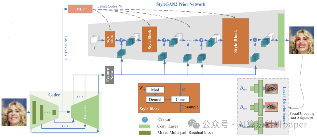 提出了一个全新的盲目人脸修复网络,结合了生成式人脸先验,可以提高具有复杂面部姿势和严重退化的人脸图像的质量。 设计了一种新颖的自监督训练策略,该策略在StyleGAN2先验模型中冻结了预训练的鉴别器(FreezeD),并与编解码器共同微调生成器。 提出了一种MMRB层,它采用两个分支的稀疏结构来提取不同尺度的特征,并通过跳跃连接实现共享特征的空间交互和聚合。