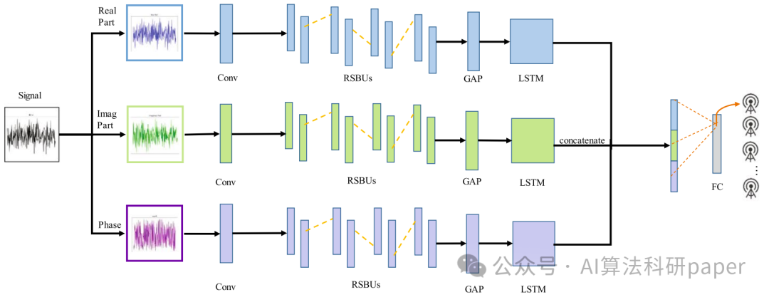 基于LSTM A RSBU-LSTM network for radio frequency fingerprint identification relying on multiple features 方法: 论文提出了一种基于长短期记忆网络的特征提取方法,用于无线电频率指纹识别。RSBU-LSTM网络模型使用了多个特征和多个RSBU来提取信号特征并抑制噪声。同时,采用LSTM提取非相邻周期信号的相关特征,并通过全连接(FC)层进行设备识别。