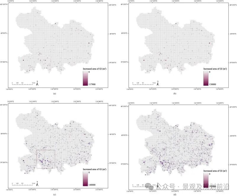 在 ArcGIS 中可视化了理想的解决方案,以及最接近 GI 总面积增加 1 %、2 % 和 5 % 的三个解决方案,以便于分析空间分布变化 (图5)。在选定的四种解决方案中,观察到了 GI 实施的分散和小规模模式。优化单元的比例按GI实施规模排序为72.42 % 、 84.14 % 、 89.30 % 和 94.69 %,平均增量为 1468.84 、 2651.72 、 3810.12 和 5603.23 m2分别。此外,分别只有 2.20 %、5.48 %、8.94 % 和 14.90 % 的优化单元被建议的 GI 扩展大于 10000 m2,尽管增量的平均值和极值有所增加。最初,优化单元主要出现在研究区的郊区。随着 GI 实施规模的增加,不仅郊区的优化单元数量进一步增加,而且城市内部也出现了更多优化单元。特别是,在这种增加期间,在西南郊区观察到了一组 GI 大幅扩张的单元。
