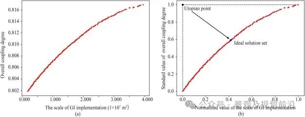 在50400 次模拟中,共获得 361 个帕累托最优解,并绘制在同一坐标系上。如图4a 所示,随着地理信息系统实施规模的扩大,整体耦合度得到了改善,并且这种改善趋向于沿着地理信息系统实施规模的方向逐步进行。在这些方案中,通过乌托邦点法选出了代表最具成本效益的地理信息投资的理想方案。这种方法可以从帕累托解决方案集中选出一个单一的最优解决方案,具体方法是将假设的理想标准(乌托邦点)与帕累托解决方案之间在归一化坐标系中的距离最小化。理想解(17553200,0.81)将 P_GrI 和 L_GrI 之间的总体耦合度从 0.80 提高到 0.81,GI 的总面积增加了 3.21%(图4b)。
