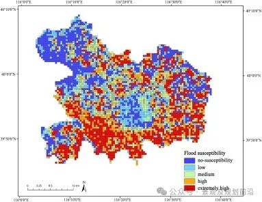 洪水易感性,即 SVM 将每个单元划分为 1 的概率,通过采用在具有偏态分布的灾害易感性分级中流行的自然断裂分级法,分为五级,即无易感性、低易感性、中易感性、高易感性和极高易感性。