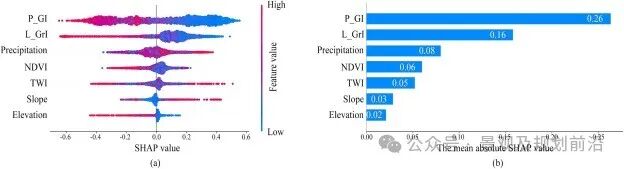 如图2a,较高的 P_GI、L_GrI、NDVI 和高程值可能会使单元更有可能被模型归类为非洪水单元。然而,发现降水和坡度具有相反的影响。在一定范围内,高 TWI 值可以加强模型将单元归类为洪水单元的趋势,但在集水区明显大于建成区的山区,高 TWI 值表现出相反的效果。此外,发现 GI 和 GrI 在横轴方向上具有最长的跨度,表明它们对分类有显着影响。