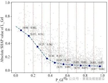 本研究提出了一种新的理解,即非洪涝单元的 L_GrI 的绝对 SHAP 值表示 GrI 在防洪方面分担的压力,该压力受其P_GI的影响。例如,对于中心区的非洪泛型机组,由于自然表面有限,大部分压力只能被极其发达的城市管网吸收,导致 L_GrI 的绝对 SHAP 值较高。相反,当 GI 达到一定规模时,GrI 将不再是洪水的决定性因素;这导致绝对 SHAP 值较低,因为排水压力由自然表面分担,例如,研究区域西部的一些单元。因此,提取所有归类为非洪水单元的单元,并根据其P_GI值和间隔为 0.1 的梯度分为 10 组。计算了每组中非洪水单位的均值P_GI和对预测L_GrI的平均贡献。