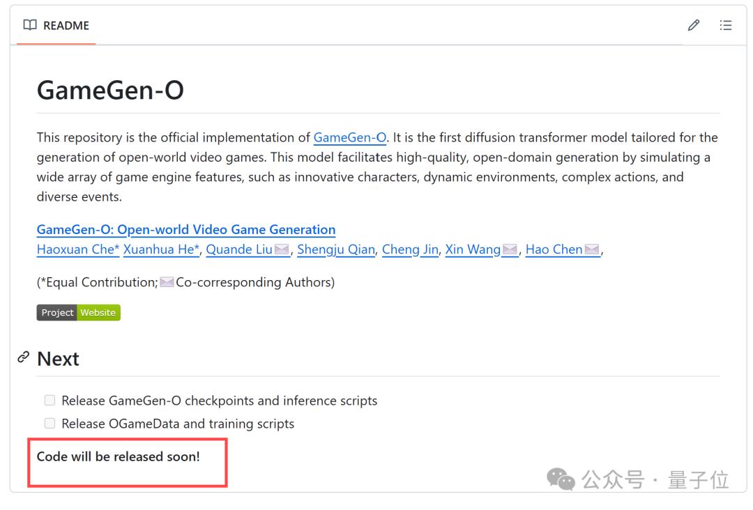 目前,GameGen-O已创建GitHub官方仓库,只不过还没来得及上传代码。