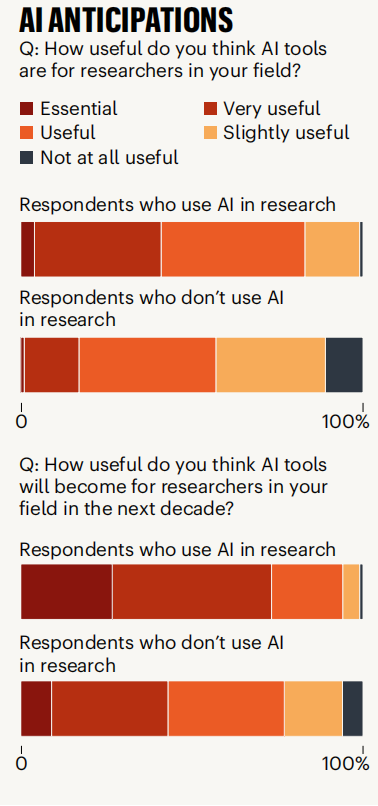 的研究者中,超四分之一的人认为AI工具在未来十年将成为领域内“必不可少的工具”,但仅有4%的人认为AI目前已经是“必不可少的”;47%的人认为AI将“非常有用”。